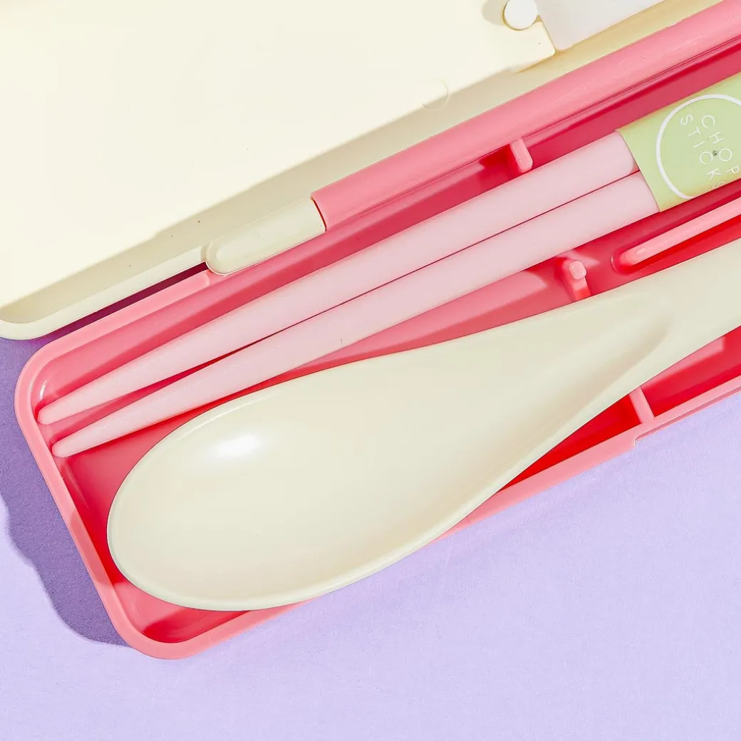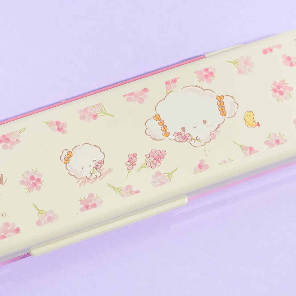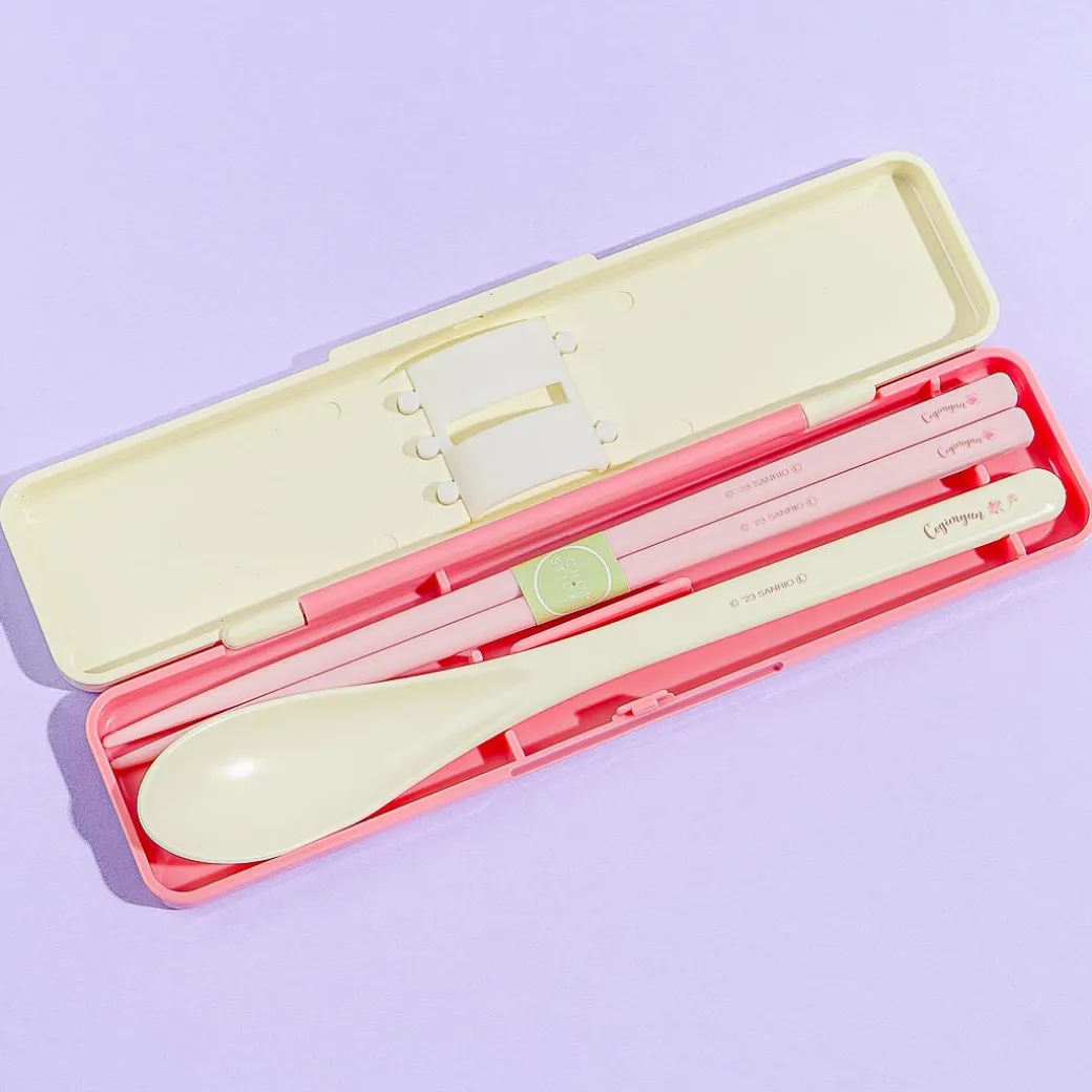 Add this kawaii utensil set to your lunch box! It features prints of Cogimyun and lots of pretty flowers. This set includes a pair of acrylic chopsticks with non-slip tips, a narrow spoon, and a carrying case. The case lid has a silicone cushion inside to prevent clicking noises!