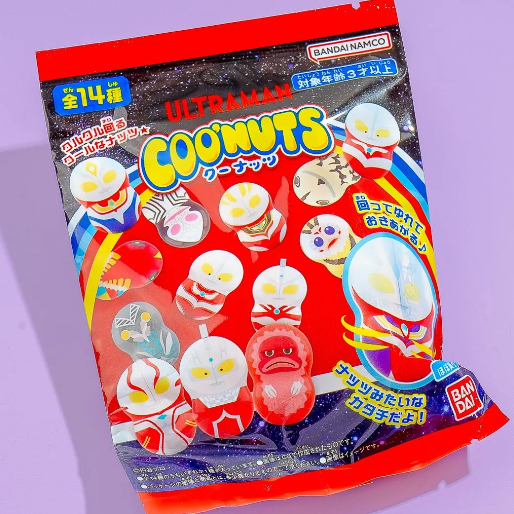 Spend your afternoon playing with this peanut-shaped Ultraman character tumbler toy! It can spin, flick, and shake. Surprise yourself with a random Ultraman character tumbler toy design from a set of 14 when you order. This fun CooNuts collectible toy also comes with a piece of soda-flavored gum!