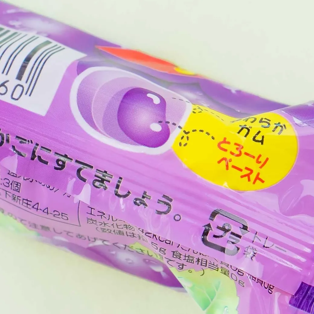- A pack of grape-flavored gumballs filled with thick grape paste