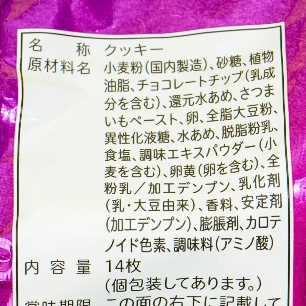 Serve this pack of delicious cookies together with your favorite tea! Inspired by sweet potato creme brulee, these cookies were made by mixing Beni Haruka sweet potato paste from the Ibaraki Prefecture with cookie dough. Each piece is speckled with tasty chocolate chips.