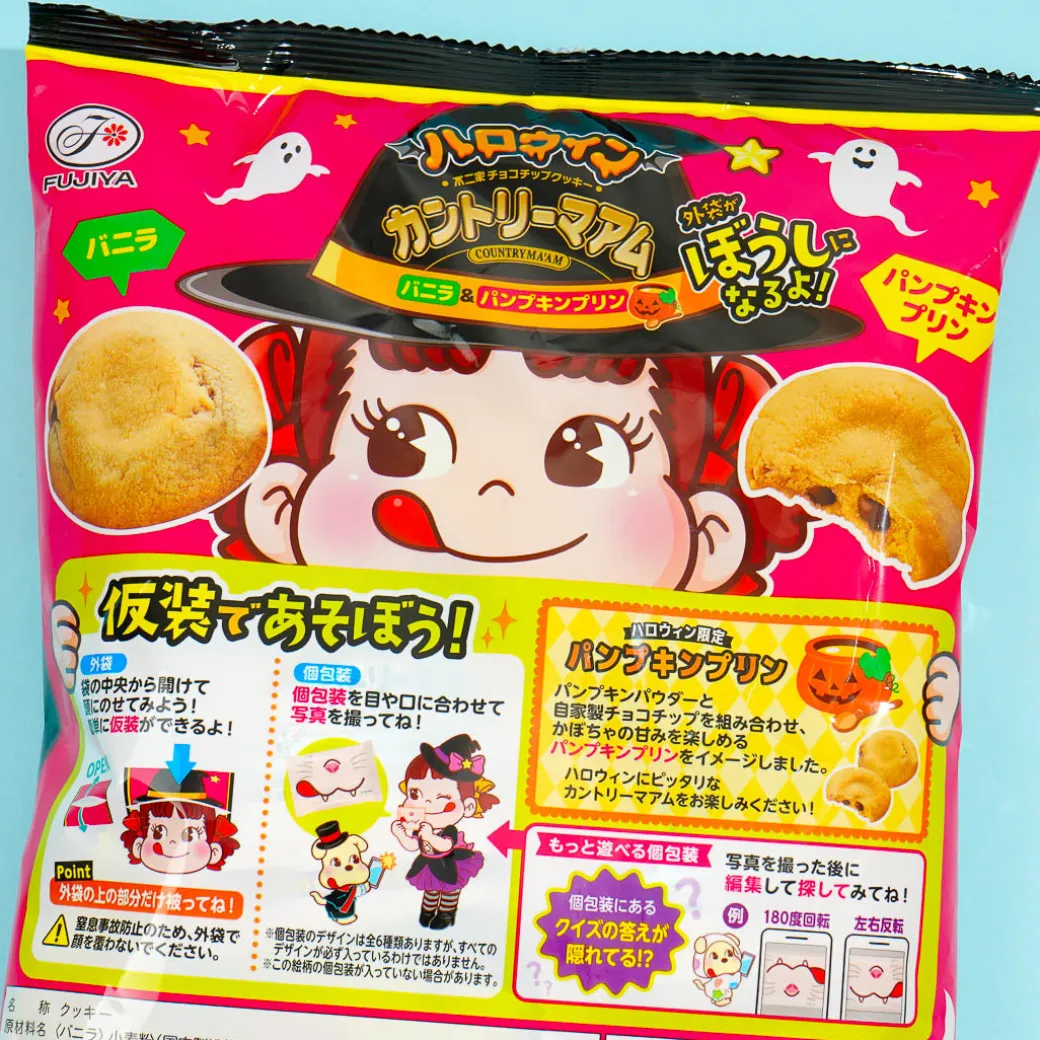 Enjoy the spooky season with this bag of assorted Country Ma’am cookies! This limited-edition assortment features classic vanilla and pumpkin pudding flavors. The packaging showcases a witch Peko-Chan for an extra touch of Halloween fun!