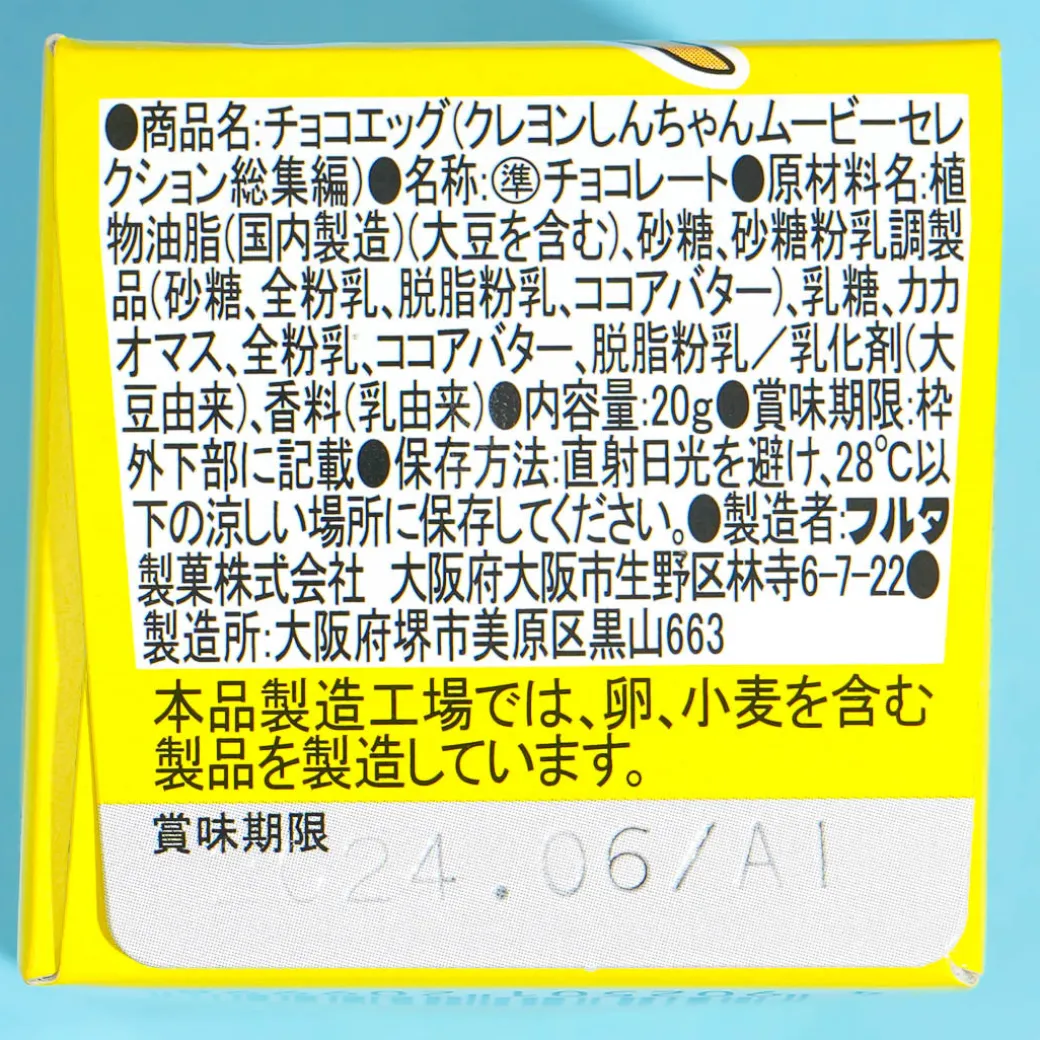 Inside this yummy choco egg is a fun surprise – a Shin-Chan character figure from the Shin-Chan Movie Compilation series! Finish eating this yummy chocolate egg to get your prize.