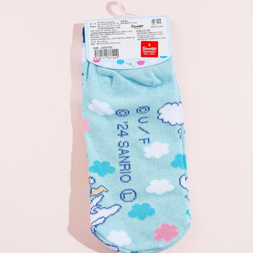 This super kawaii pair of socks is illustrated with Shin-Chan and his friends flying in the sky with Cinnnamoroll! It comes from a collab between Crayon Shin-Chan and Sanrio. Wear these socks when you head out to the park.