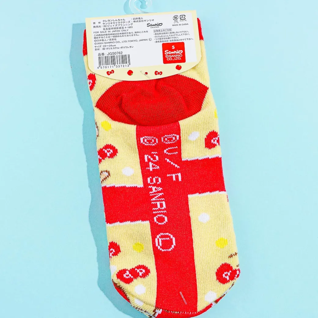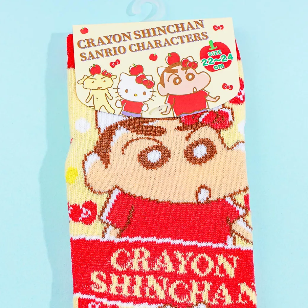 Wear this super cute pair of socks with your kawaii outfit! It features an illustration of Hello Kitty and Crayon Shin-Chan enjoying bright red apples. This comes from a collab between Sanrio Characters and Crayon Shin-Chan.