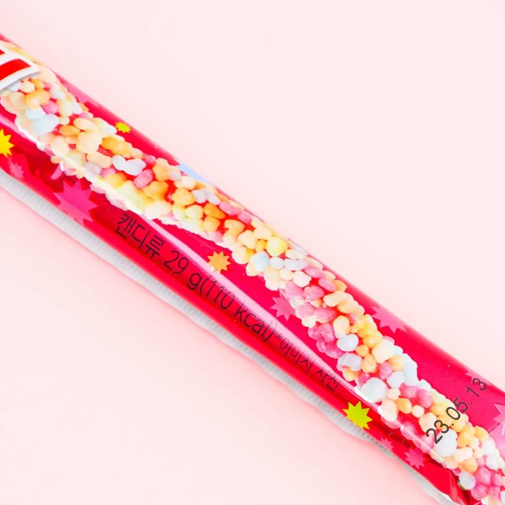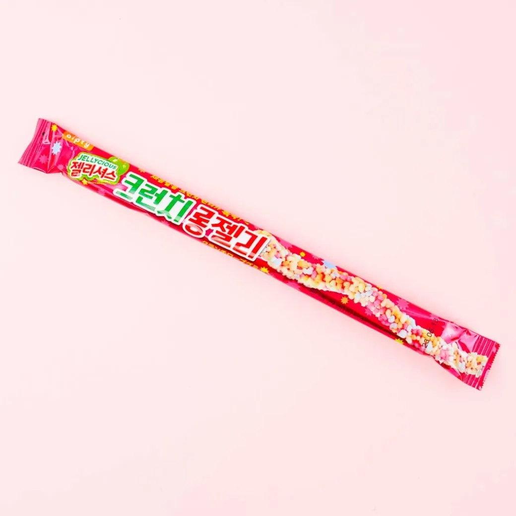 - A stick of long sweet gummy rope coated with colorful sour fruit ramune candy bits