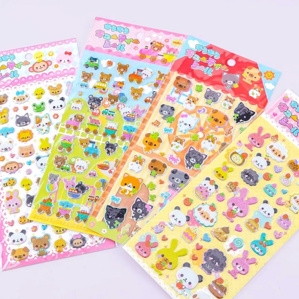 - A kawaii sheet of glittery die-cut stickers illustrated with cute animals