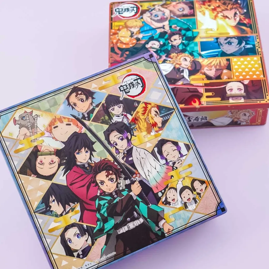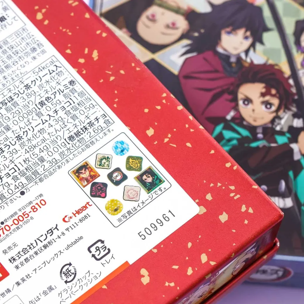 - A square tin can filled with assorted cream-filled chocolate treats featuring the characters of Demon Slayer: Kimetsu No Yaiba