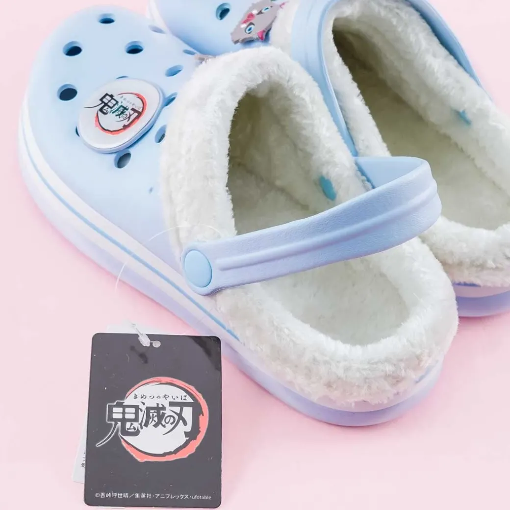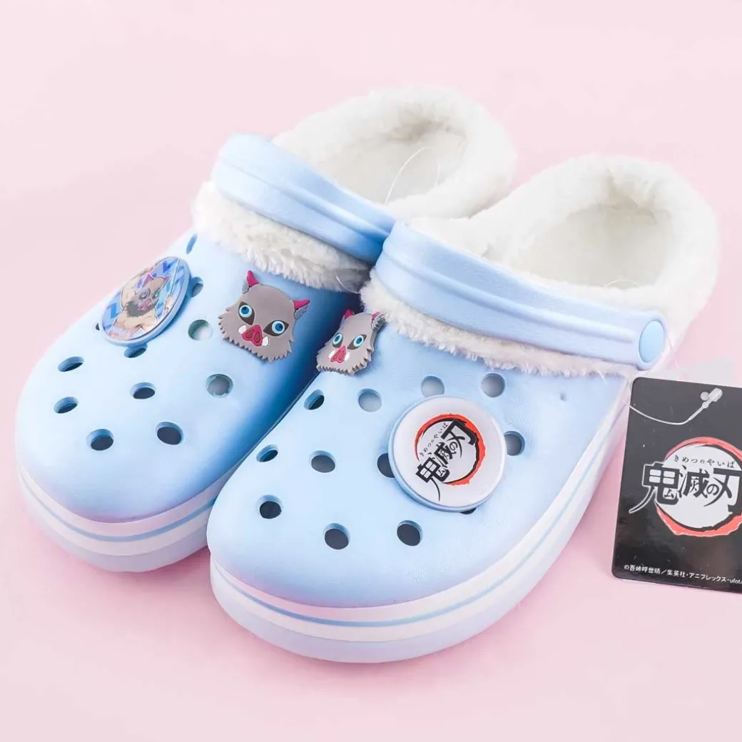 - A cute pair of large-sized clog sandals featuring a print of Inosuke Hashibira from Demon Slayer