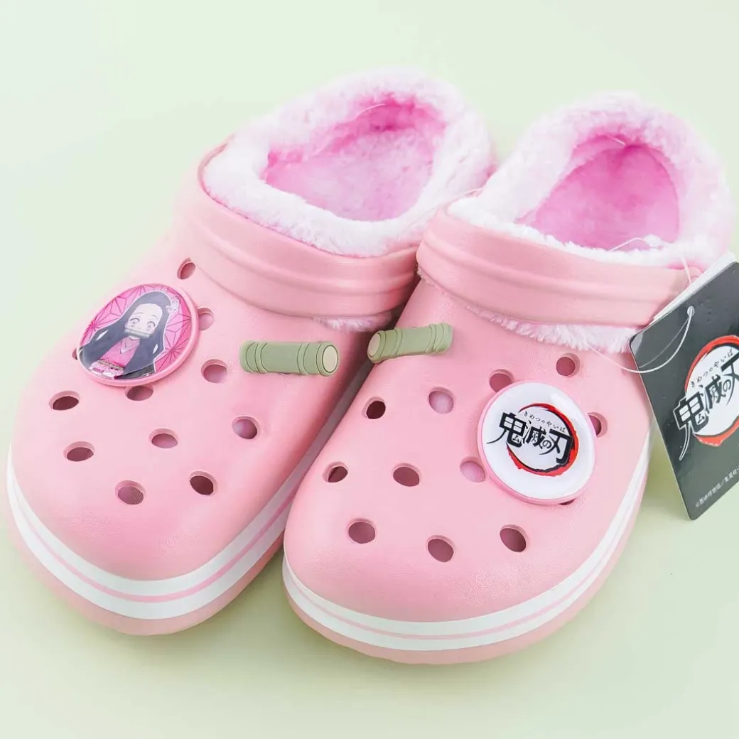 - A kawaii pair of small clog sandals with an illustration of Nezuko Kamado from Demon Slayer