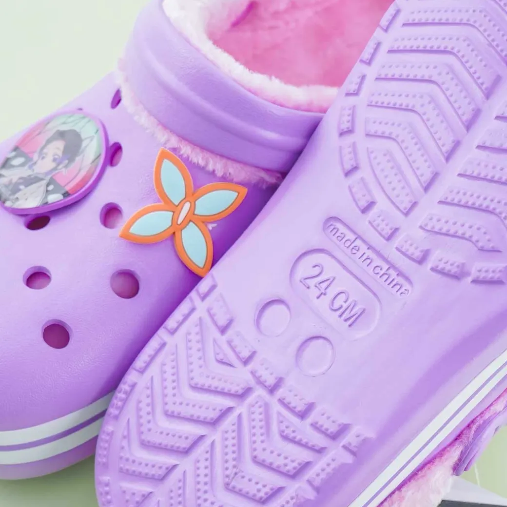- A kawaii pair of large-sized clog sandals featuring a print of Demon Slayer character Shinobu Kocho