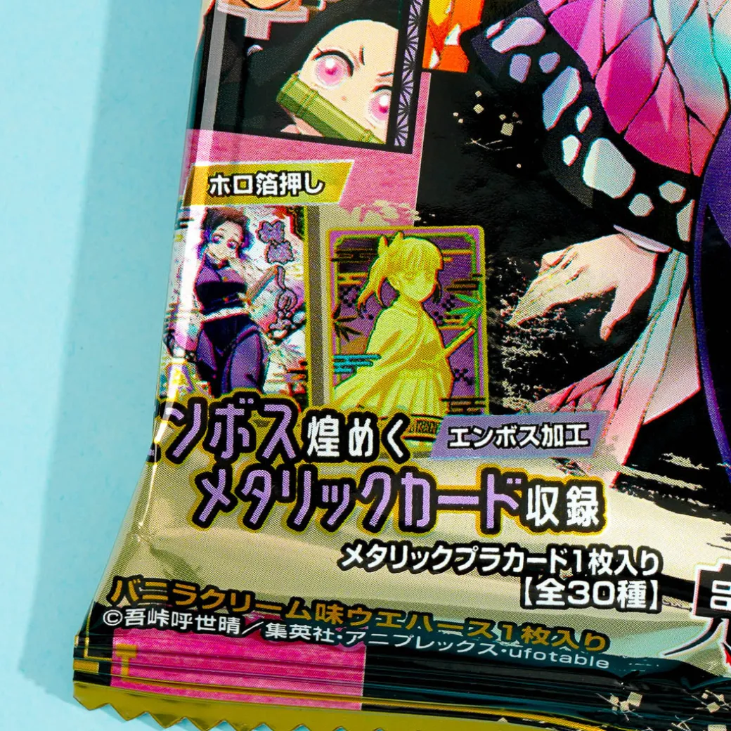 This vanilla cream wafer pack features prints of characters from the popular anime series, Demon Slayer. Snack on it while watching your favorite anime! It comes with a collectible Demon Slayer card. Surprise yourself with a random card from a set of 30 different designs when you order.