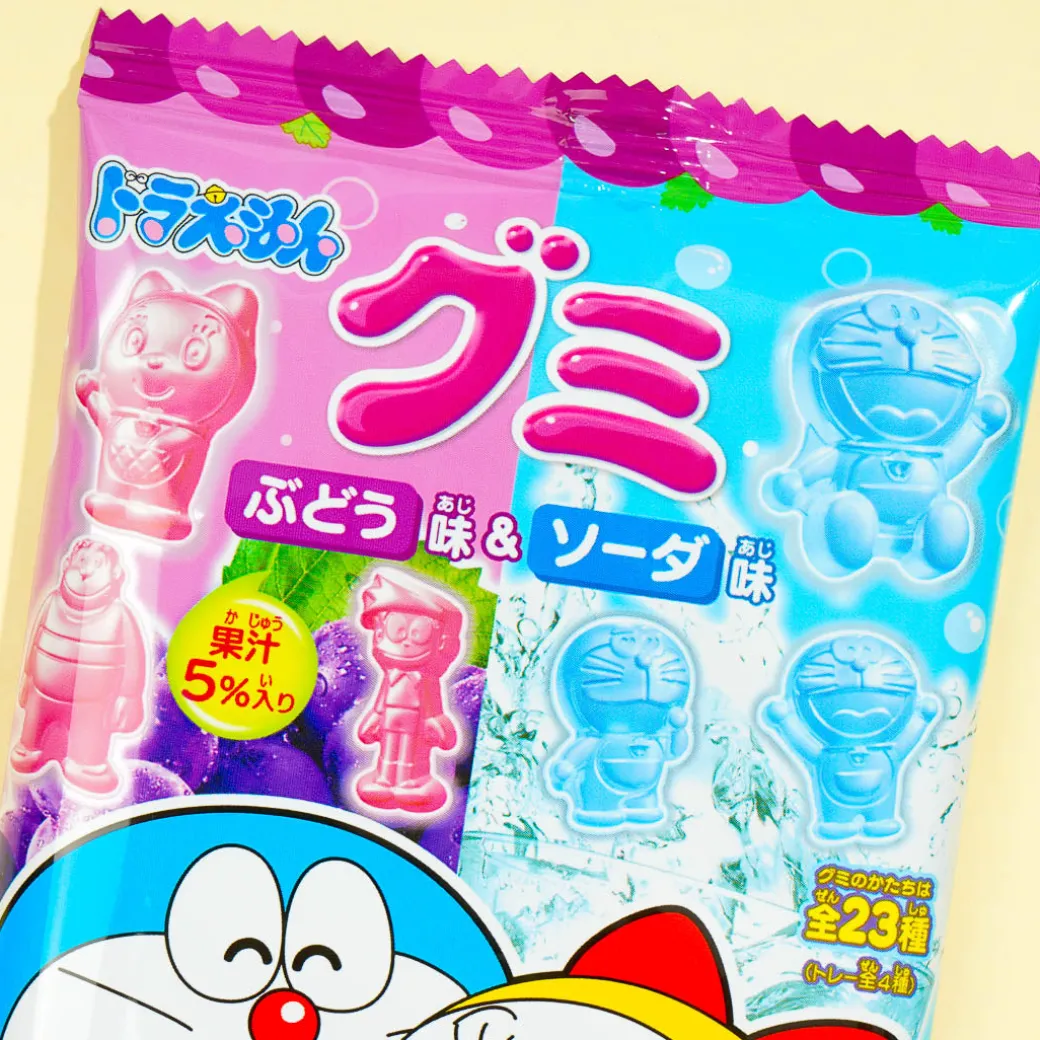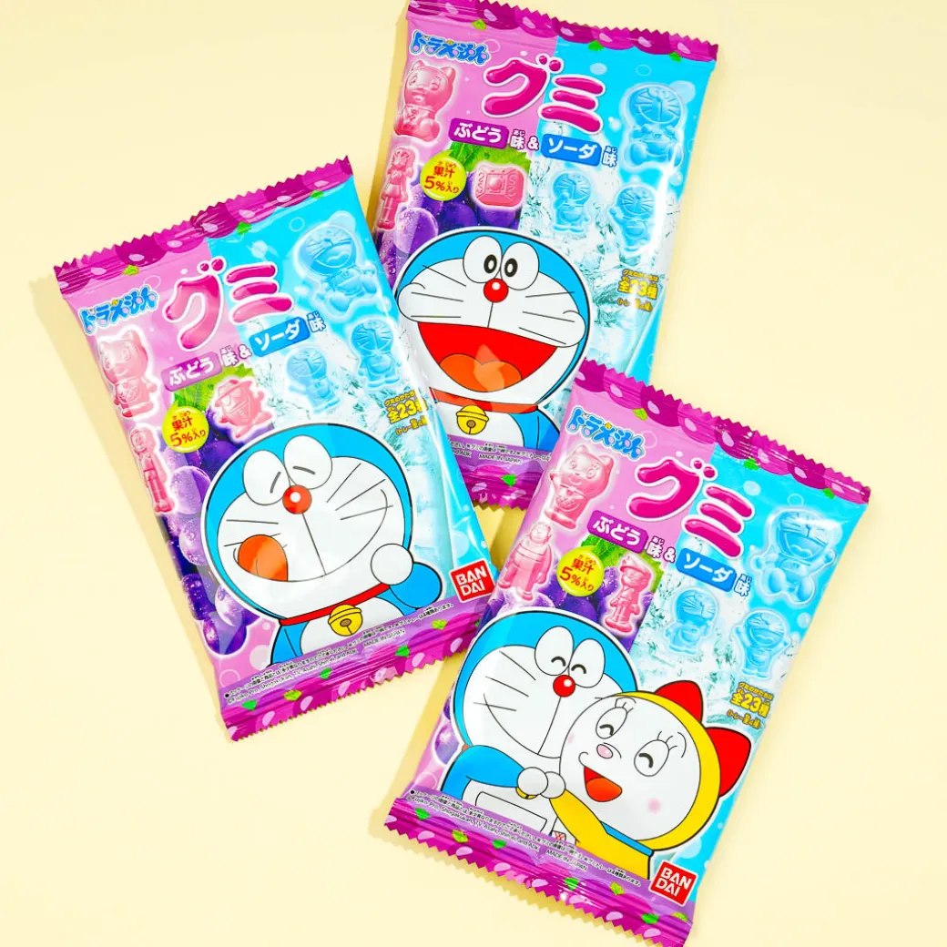 These gummy candies are shaped like characters and objects from the Doraemon anime! Share this pack of gummies with your anime-loving buddies. Enjoy two different flavors in the packs – grape and soda! Surprise yourself with a random package design when you order.