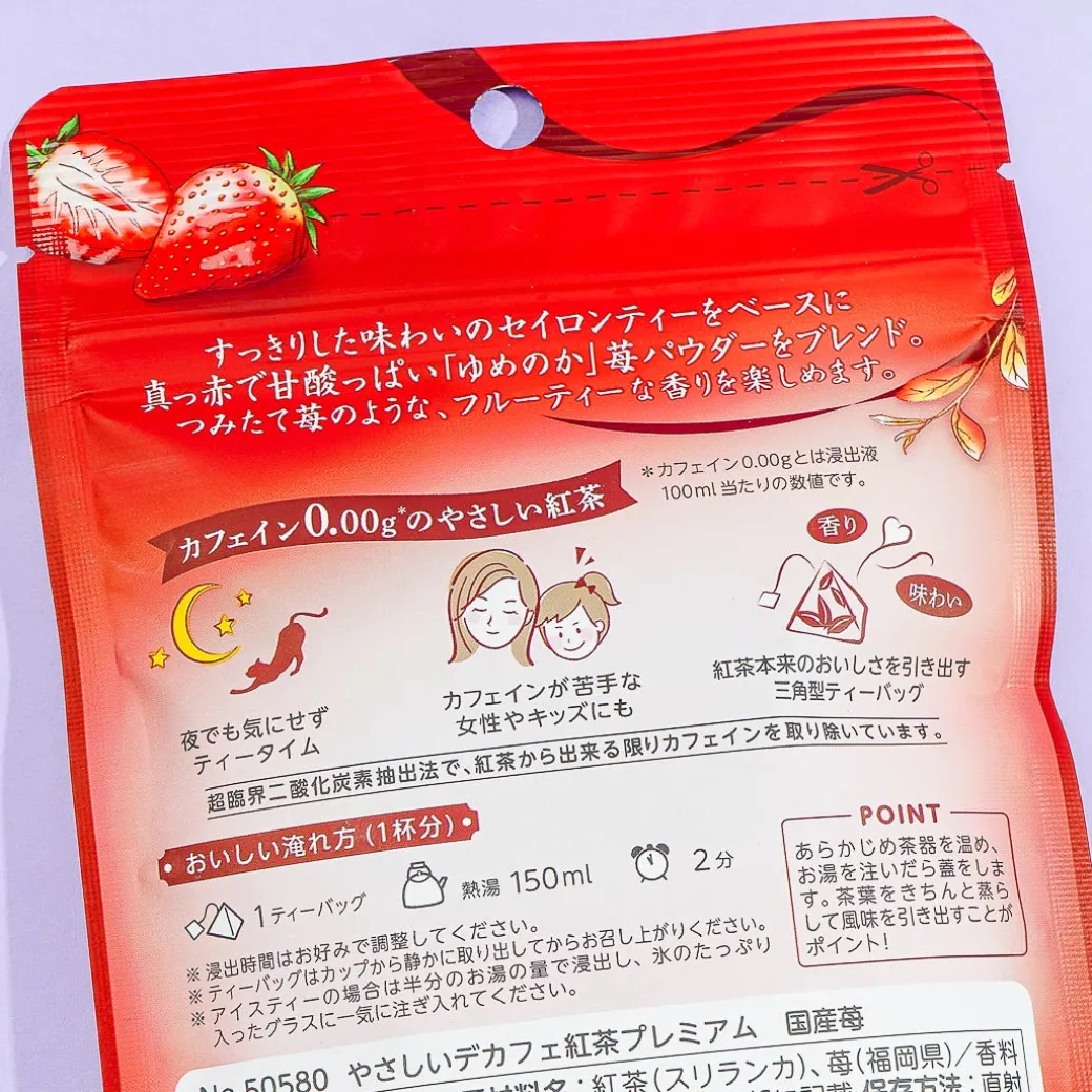 Enjoy the fruity scent of freshly picked strawberries with a cup of this premium black tea! It’s made with a blend of sweet Yumenoka strawberry powder and refreshing Ceylon tea. This decaffeinated drink is perfect for people who don’t like caffeine, and you can drink it even at night!