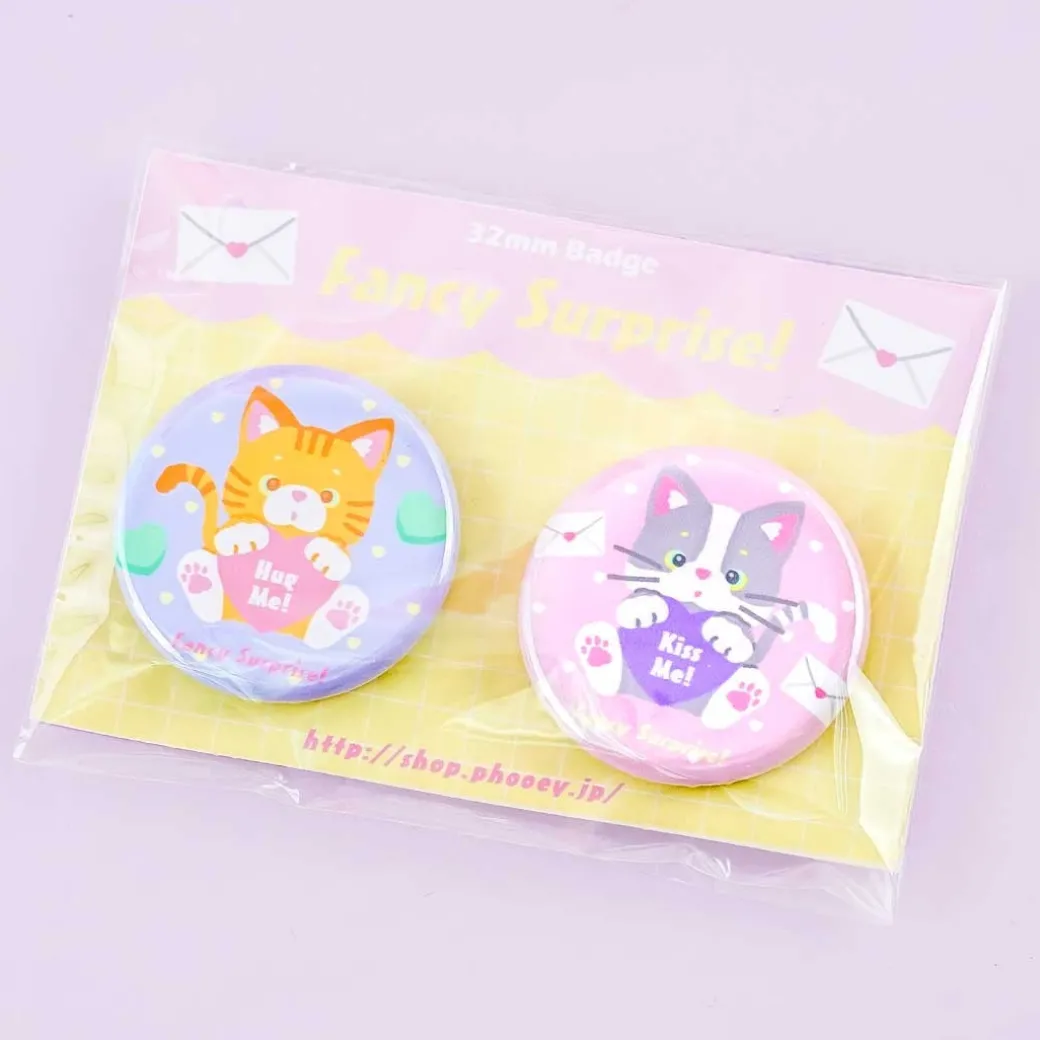 - A cute set of badges featuring prints of cute kittens holding up signs