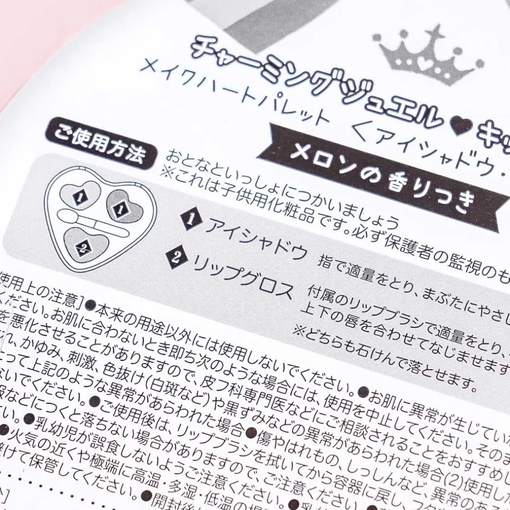 - A kawaii lip gloss and eyeshadow palette in a heart-shaped clear case with illustrations of girly objects like perfume, earrings, and lipstick