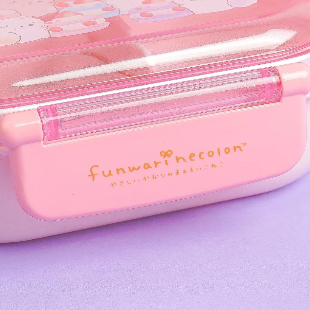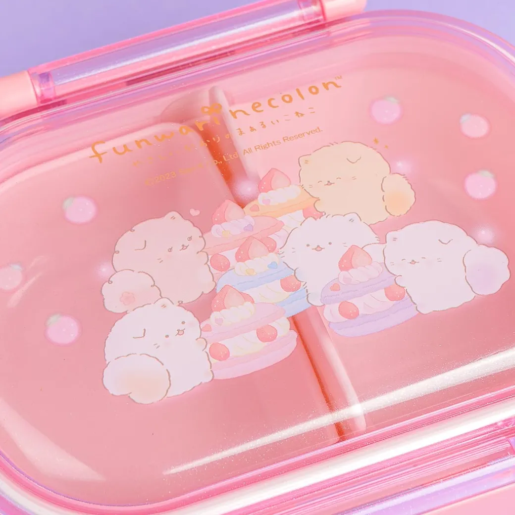 Create kawaii-looking bento meals and place them in this cute lunch box! It features kawaii prints of Funwari Necolon characters enjoying a strawberry shortcake. This container comes with a raised snap-on lid and a removable compartment and partition.
