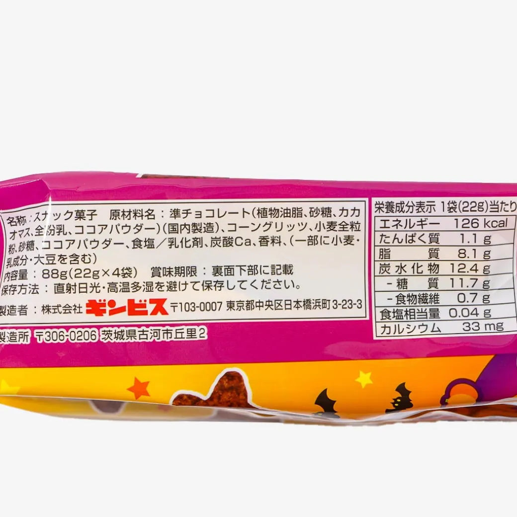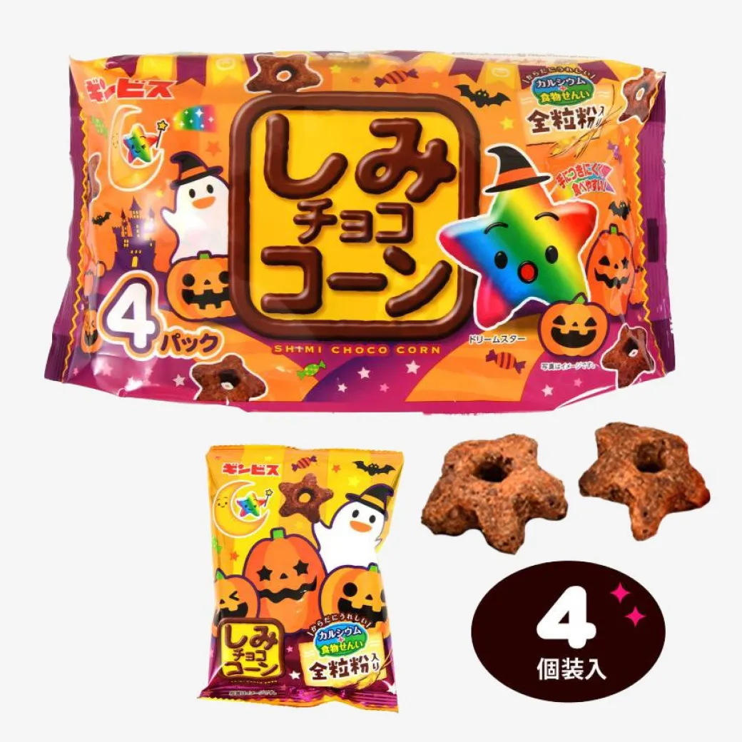 These star-shaped corn puffs are made with whole wheat and soaked in delicious sweet chocolate. The pack contains 4 mini packs, so you can share them with your friends as you celebrate Halloween!