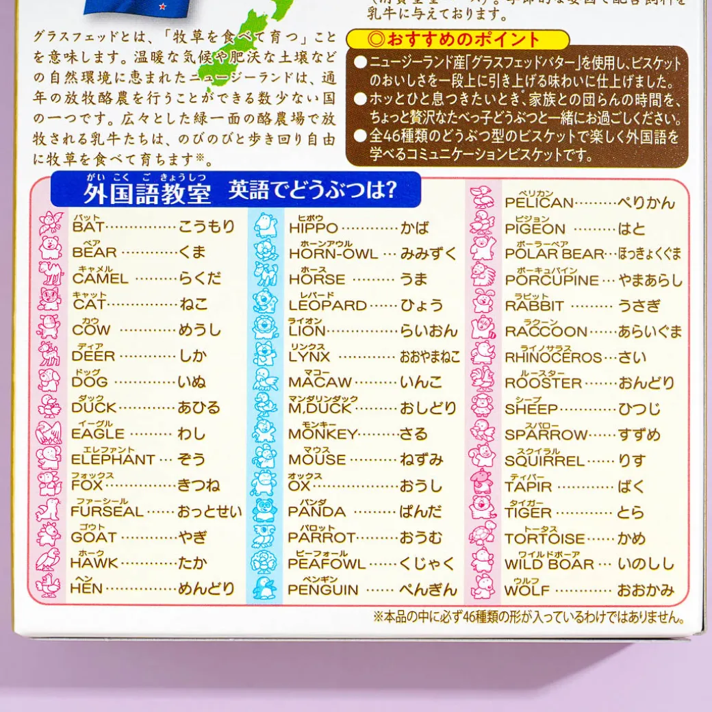 Have fun munching on these animal-shaped biscuits while learning animal names! Each piece features a rich, high-quality butter flavor and has a print of the animal’s English name.