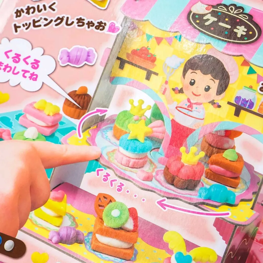 - A DIY clay molding kit featuring a tiny cake shop with rotating shelf