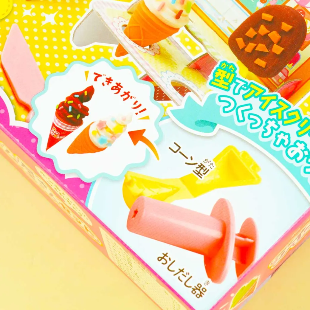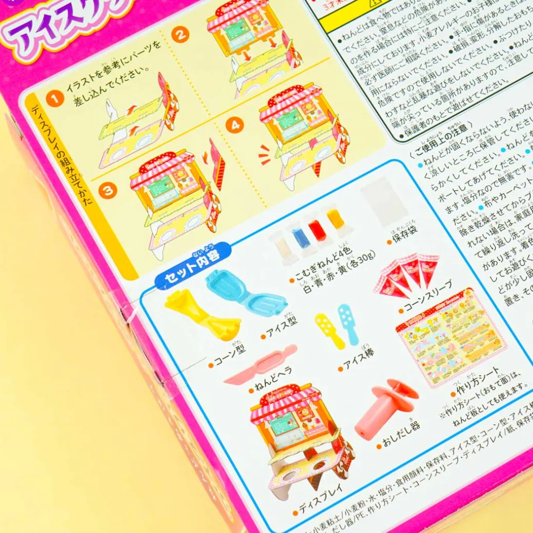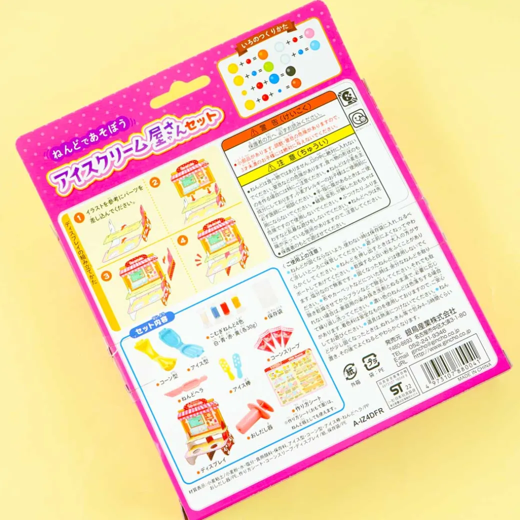 - Included: 4 x rice flour clay, 1 x cone mold, 1 x ice drop mold, 1 x plastic shaping knife, 2 x ice cream sticks, 4 x paper cone sleeves, 1 x mini plastic bag, 1 x push mold, 1 x instructions sheet, and 1 x mini storefront
