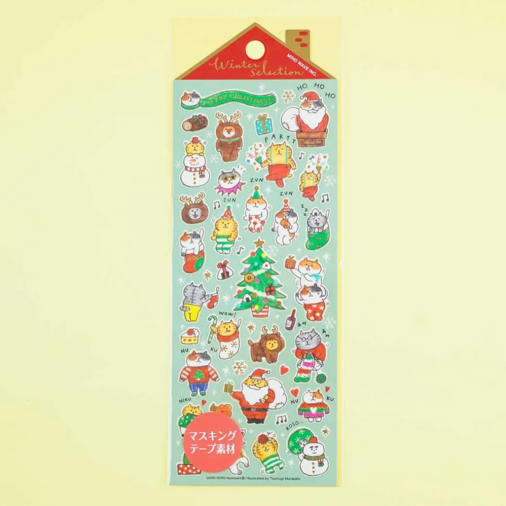 - A super cute sheet of die-cut stickers with golden details illustrated with Gorogoro Nyansuke characters having an X-mas party