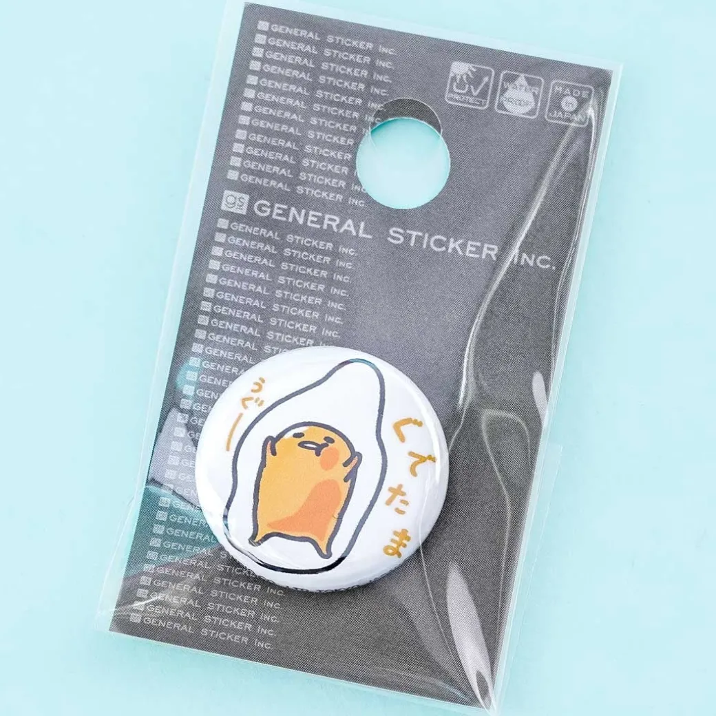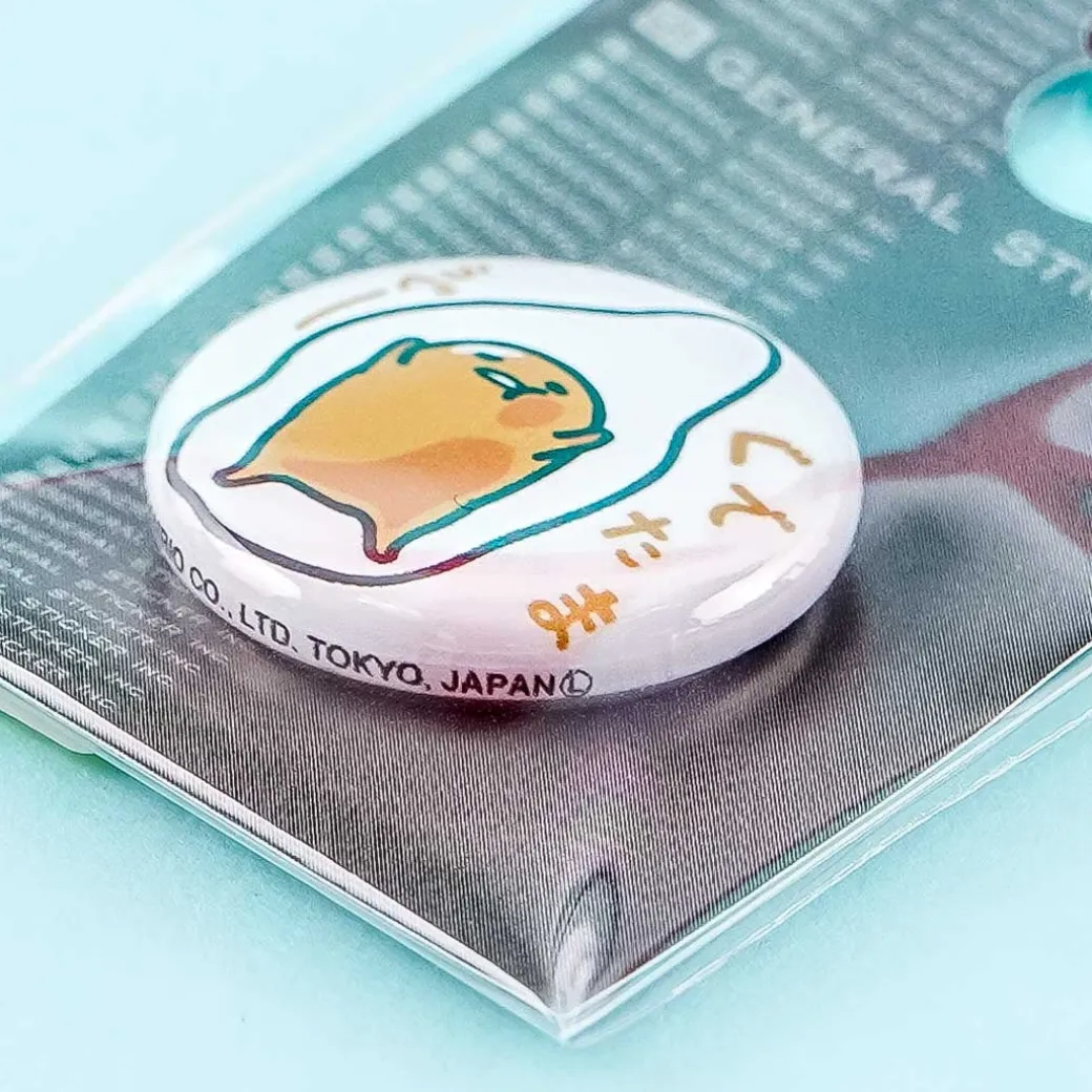 - A kawaii mini badge decorated with a print of Gudetama flat on his back