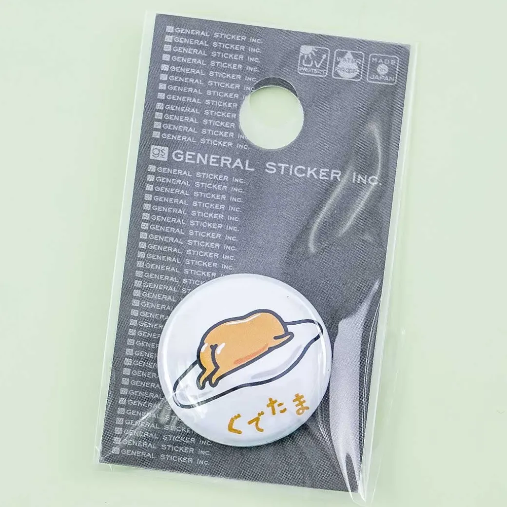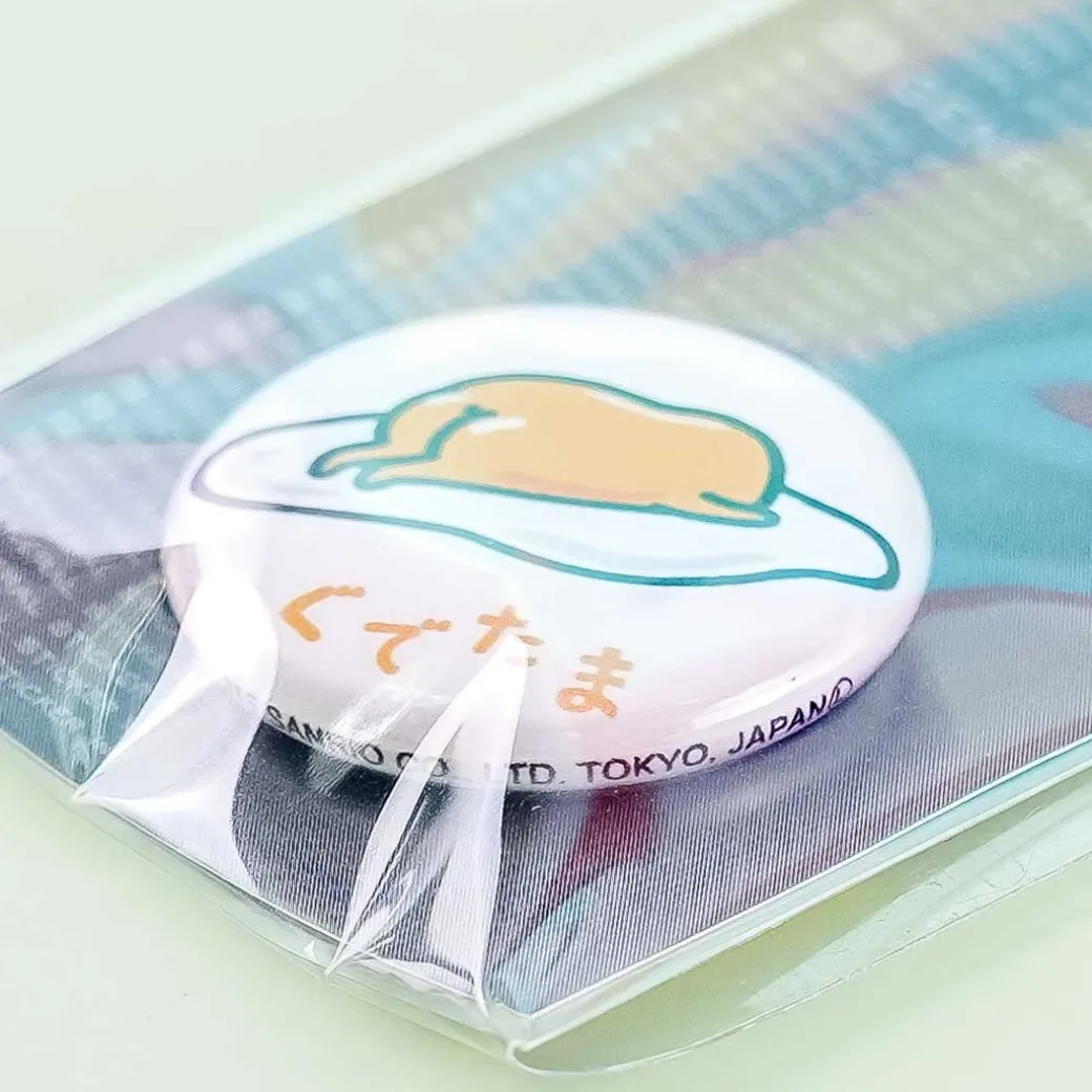 - A cute pin badge illustrated with a print of Gudetama