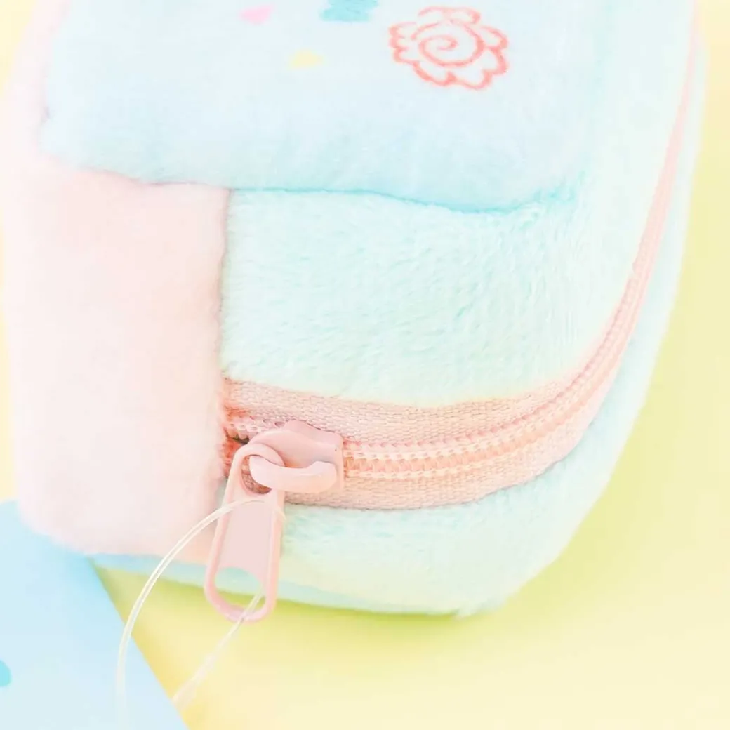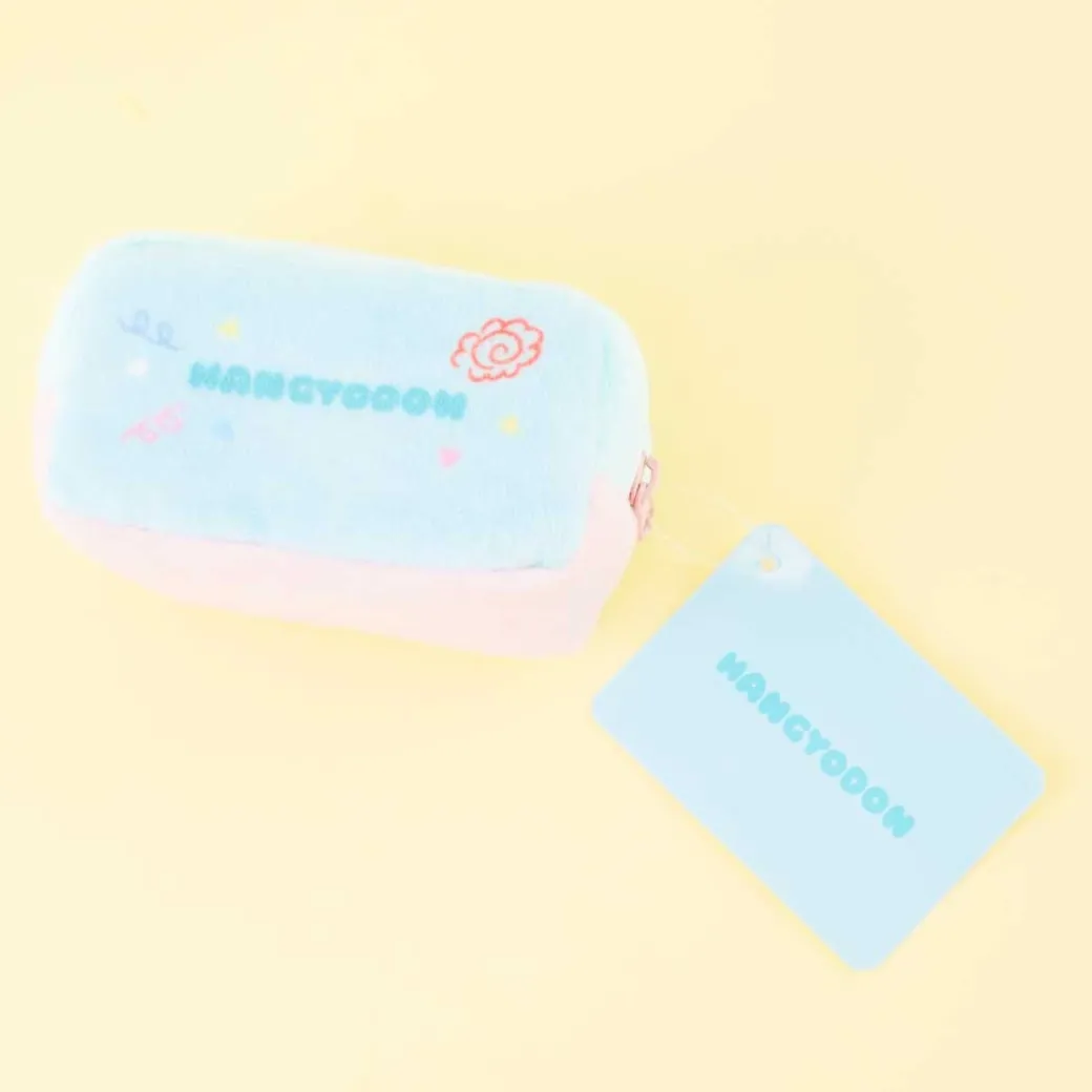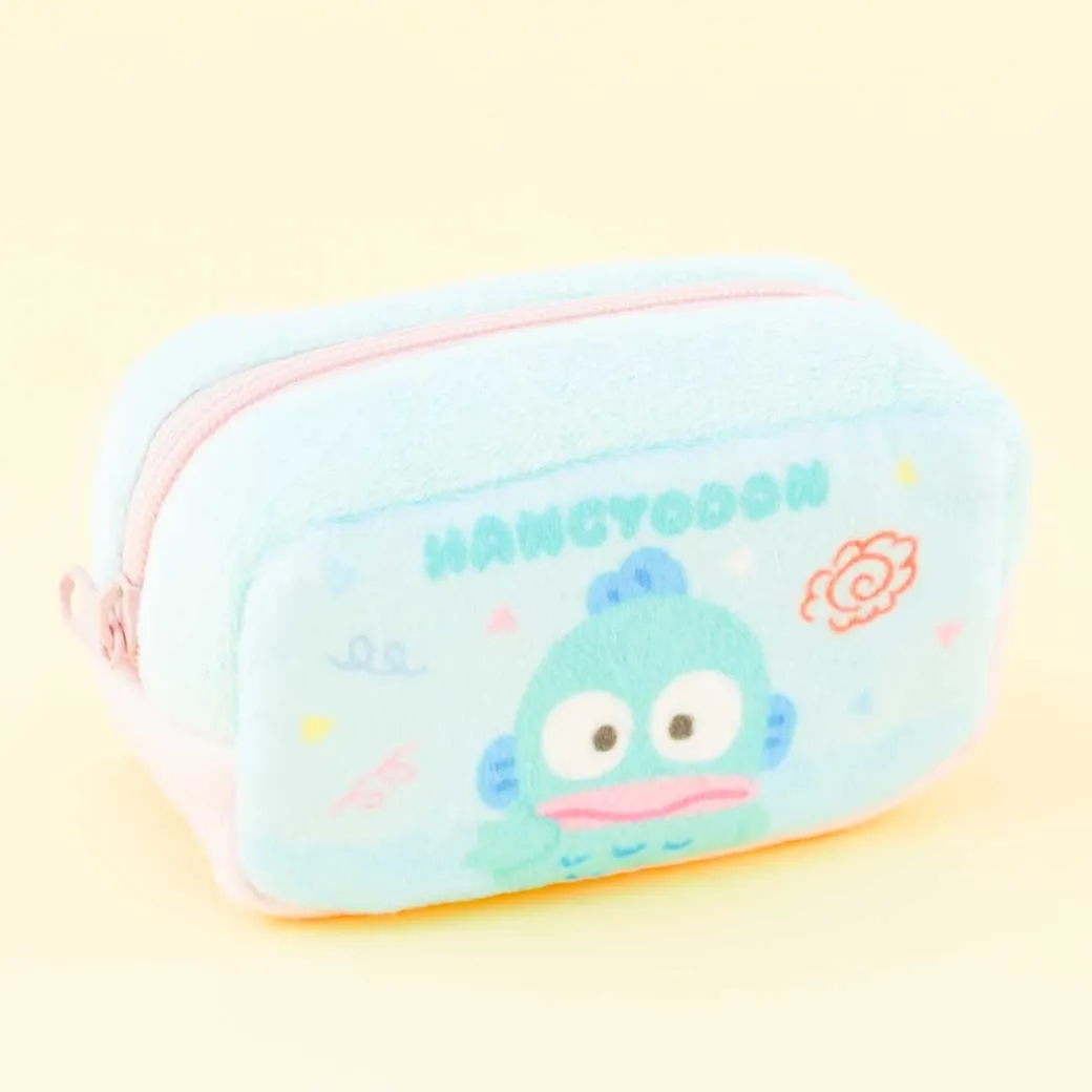 - A kawaii fluffy zippered mini pouch showcasing prints of Hangyodon and confetti