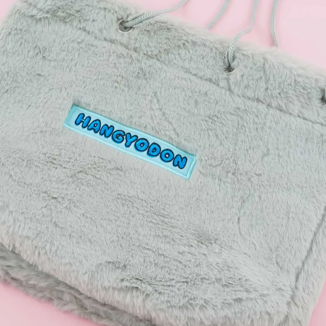 - A cute soft and furry shoulder bag with an embroidered print of Hangyodon