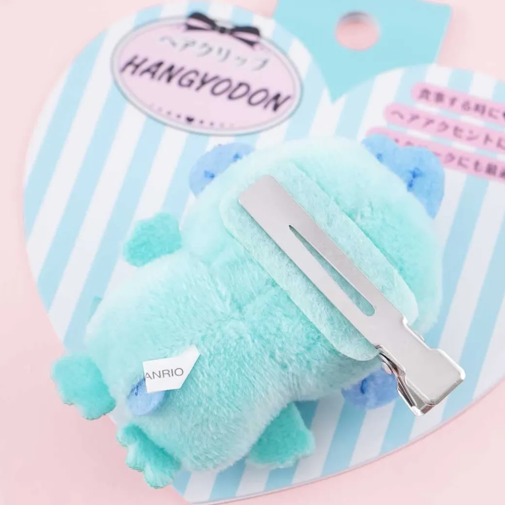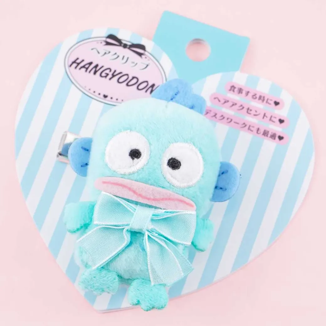 - A kawaii Hangyodon plushie hair clip wearing a ribbon