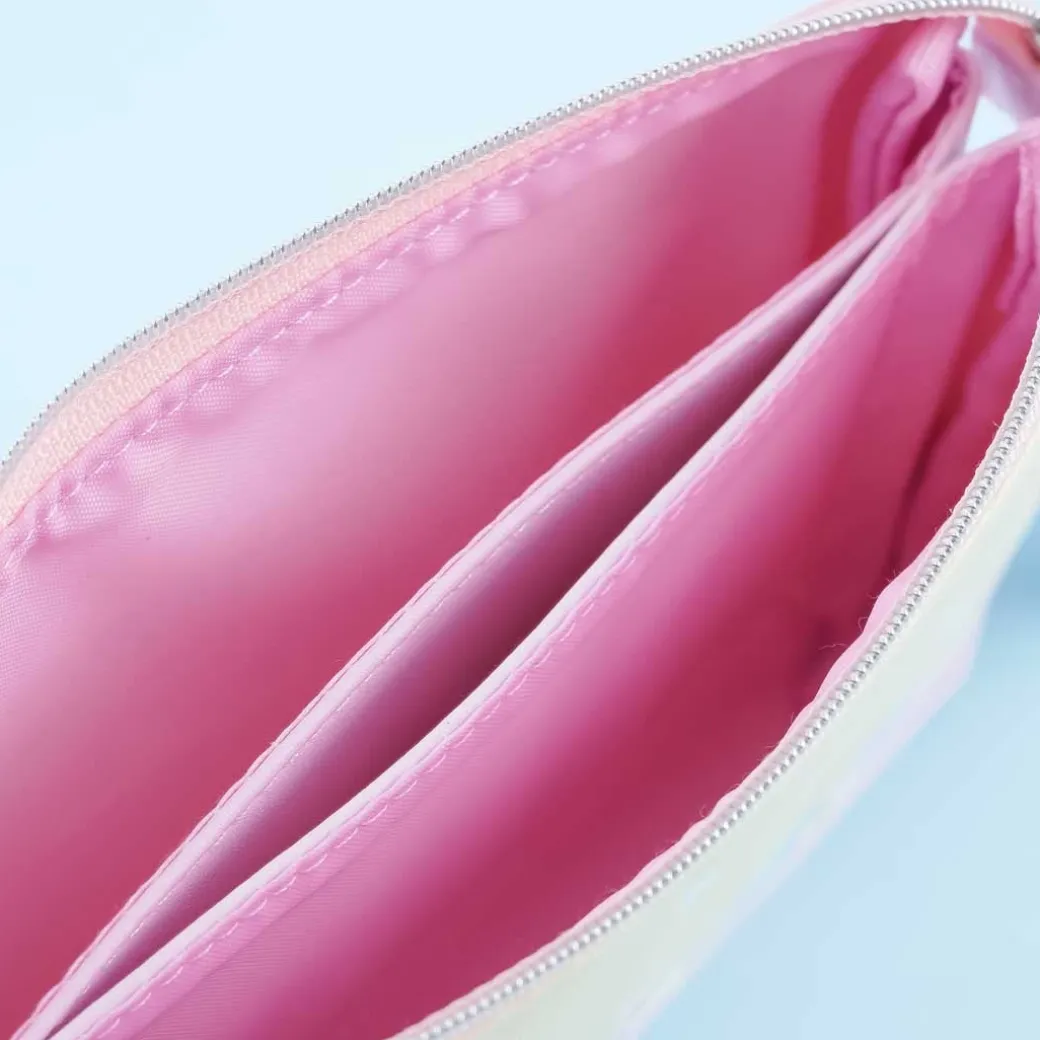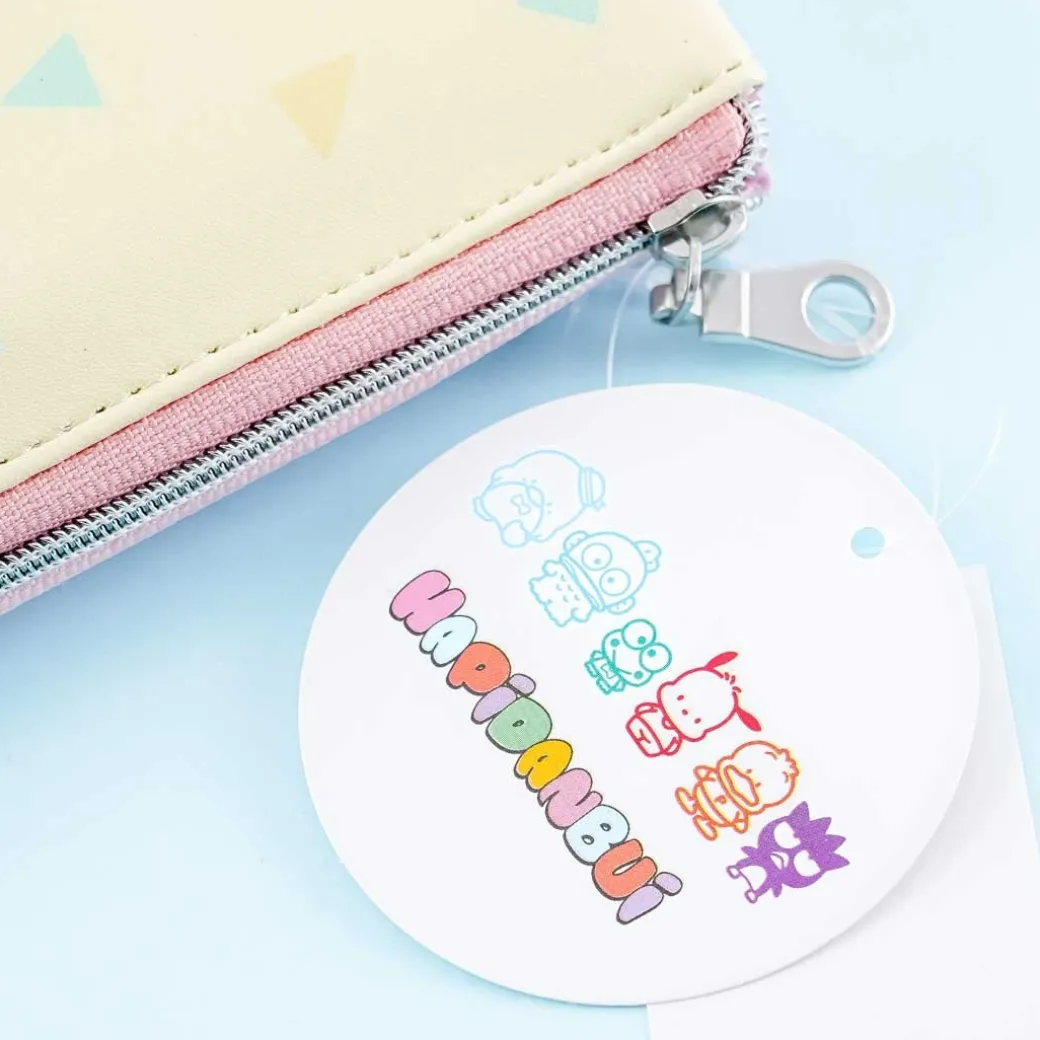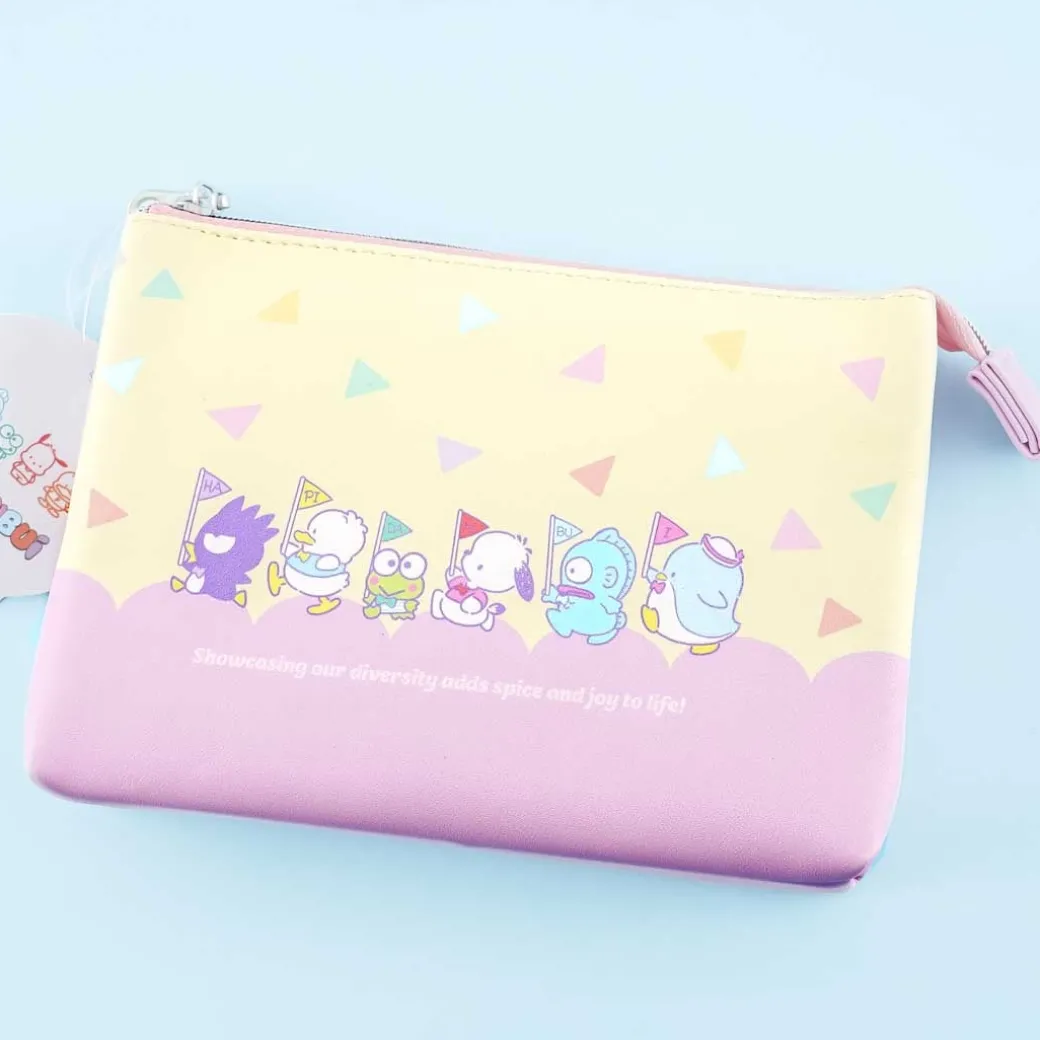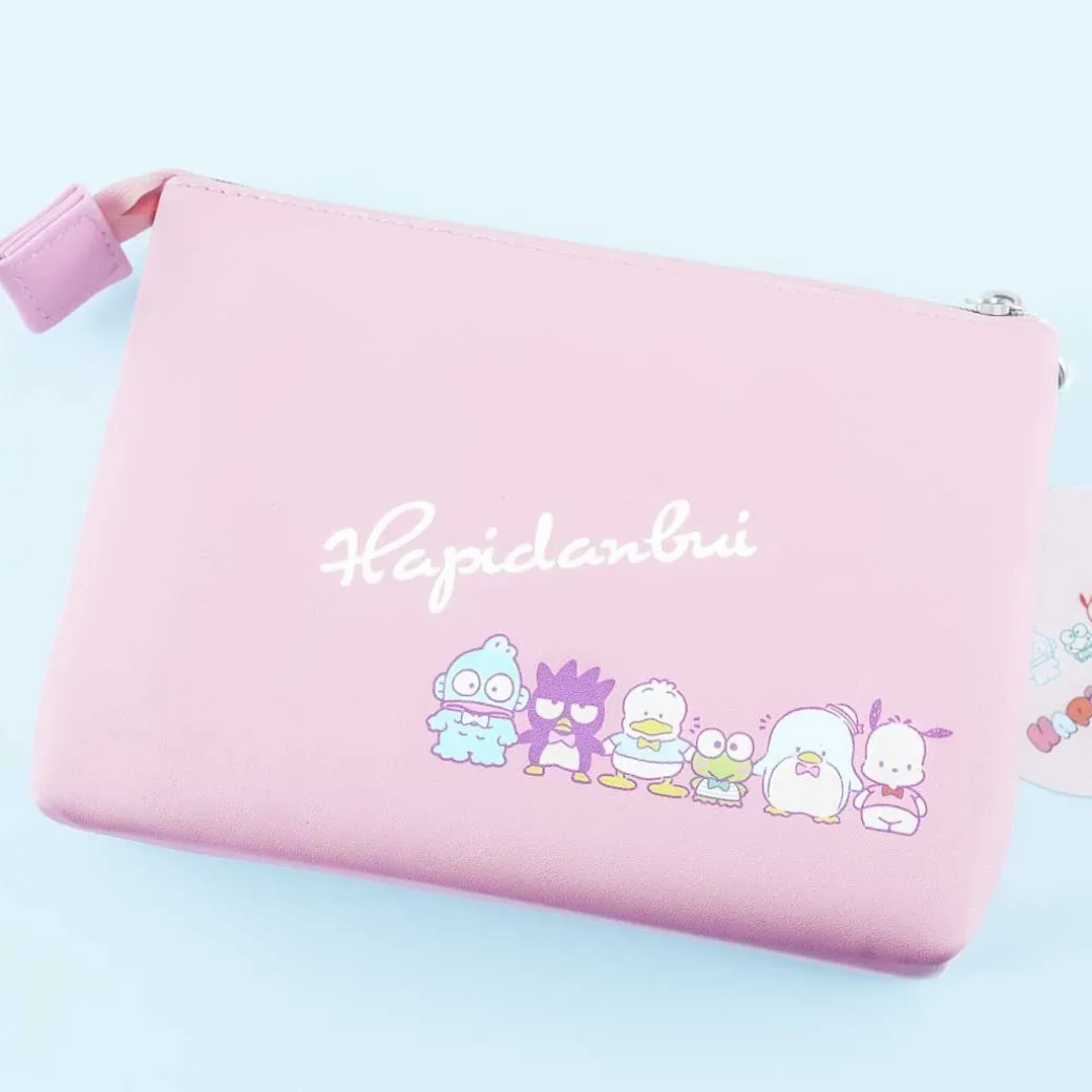 - A cute makeup pouch featuring illustrations of the Hapidanbui characters holding a flag