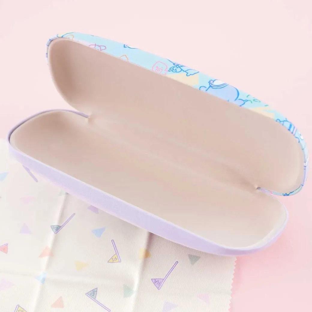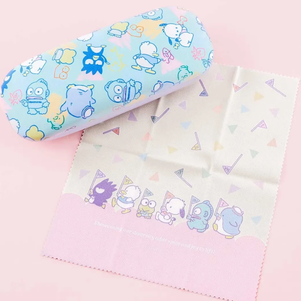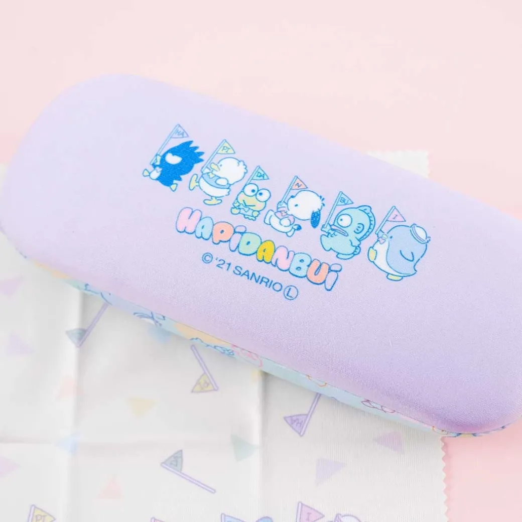 - A cute eyeglass case featuring illustrations of the Hapidanbui characters holding a flag