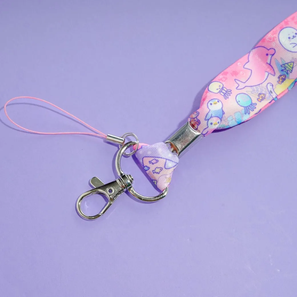 Have fun wearing your school or work ID with this kawaii pink lanyard! It’s decorated with cute illustrations of different happy-looking sea creatures like dolphins, seals, jellyfish, and more! The lanyard also has an adjustable strap, a metal clip, and a mobile phone cloth loop.