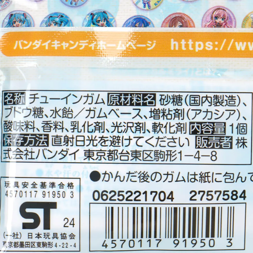 Kawaii-fy your bag with this super cute can badge! It features illustrations of Hatsune Miku and other Piapro characters with the Magical Mirai theme. Try to collect all 17 designs and trade with your friends! This pack even includes a piece of soda-flavored gum for you to enjoy.