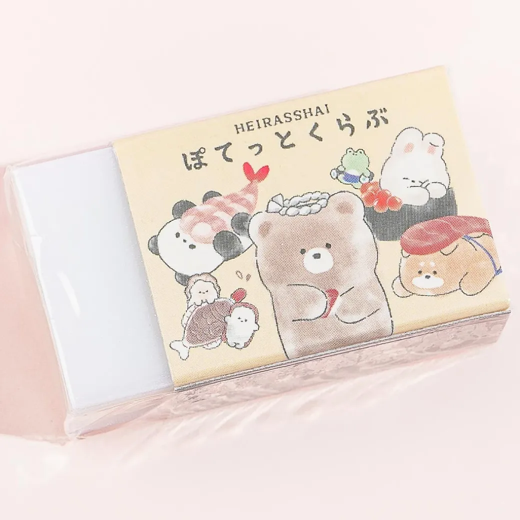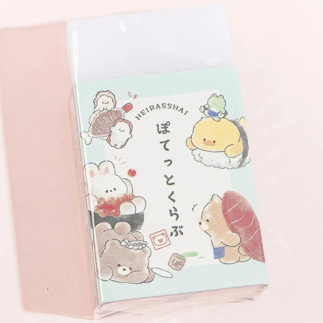 Keep your drawings free or dirt and errors by using this handy eraser! Its cardboard cover features cute illustrations of the cuddly animals like bears, bunnies, and ducks — all dressed as different sushi.