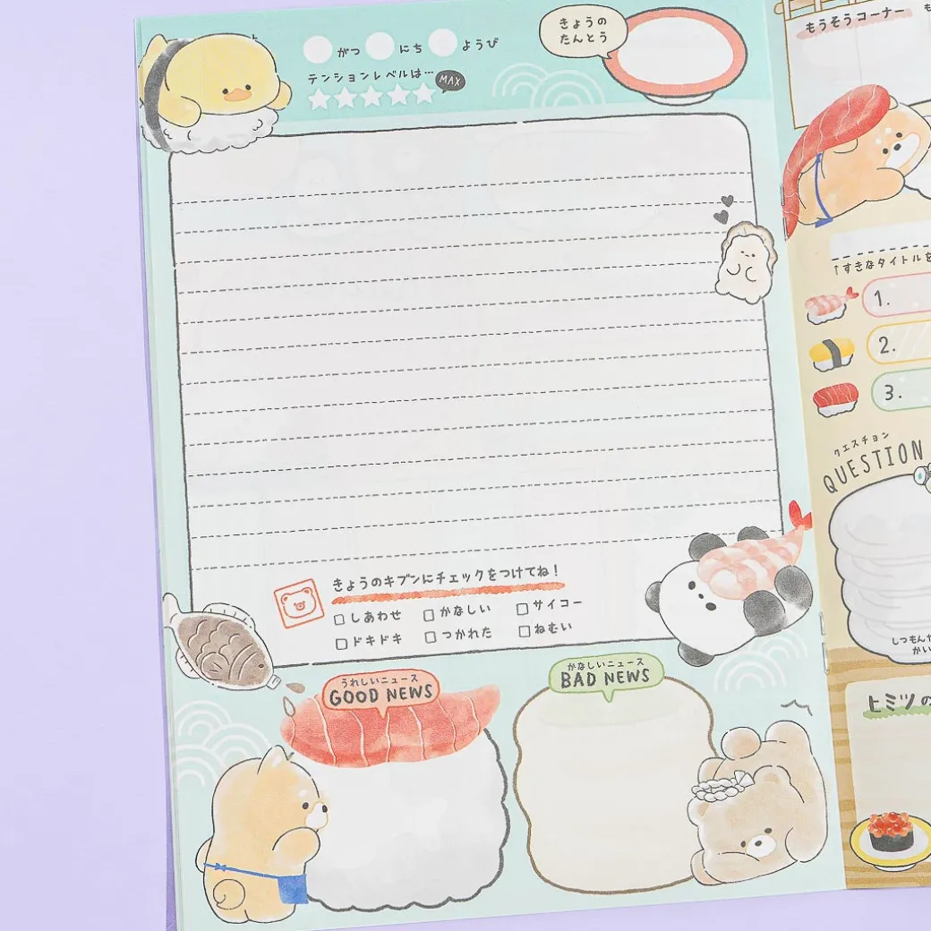 Practice writing stories and poems with this super kawaii notebook. It showcases prints of cute animals transformed into sushi! This A5 notebook has printed sheets with line grides, a personality chart, and a fortune-telling roulette game.