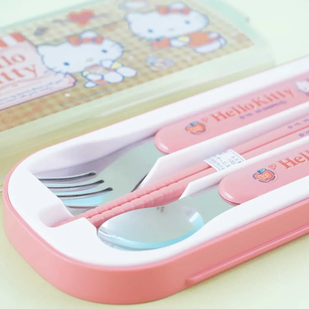 - A super cute utensil set covered in prints of Hello Kitty eating treats from an apple cafe