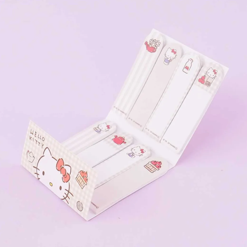 - A super kawaii set of sticky tabs with illustrations of Hello Kitty and her favorite objects at home