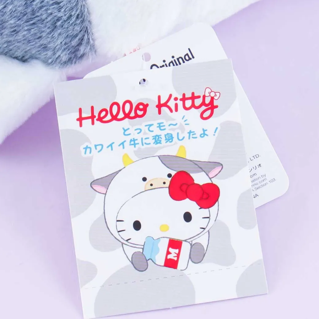 - A super cute medium-sized Hello Kitty plushie wearing a cow onesie