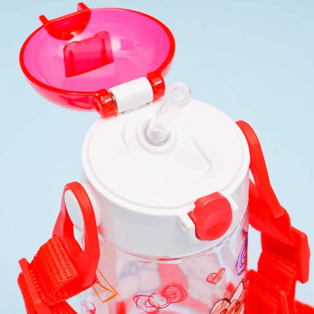 - A cute transparent water bottle decorated with crayon illustrations of Hello Kitty