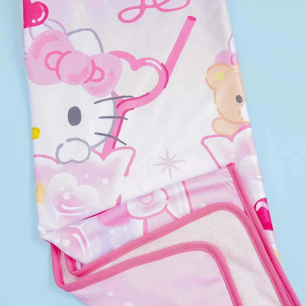 Take a comfy nap with this cute breathable blanket. It features cute prints of Hello Kitty with her bear friends in glasses of cream soda. The blanket also has a pocket you can fold the blanket into.