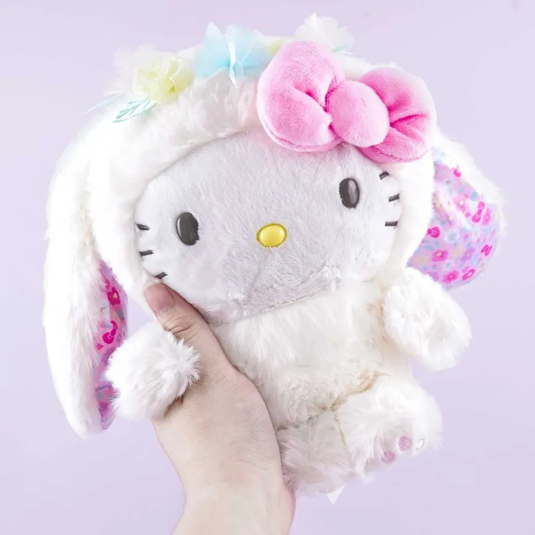 - A super kawaii medium-sized Hello Kitty plushie wearing a flowery bunny onesie