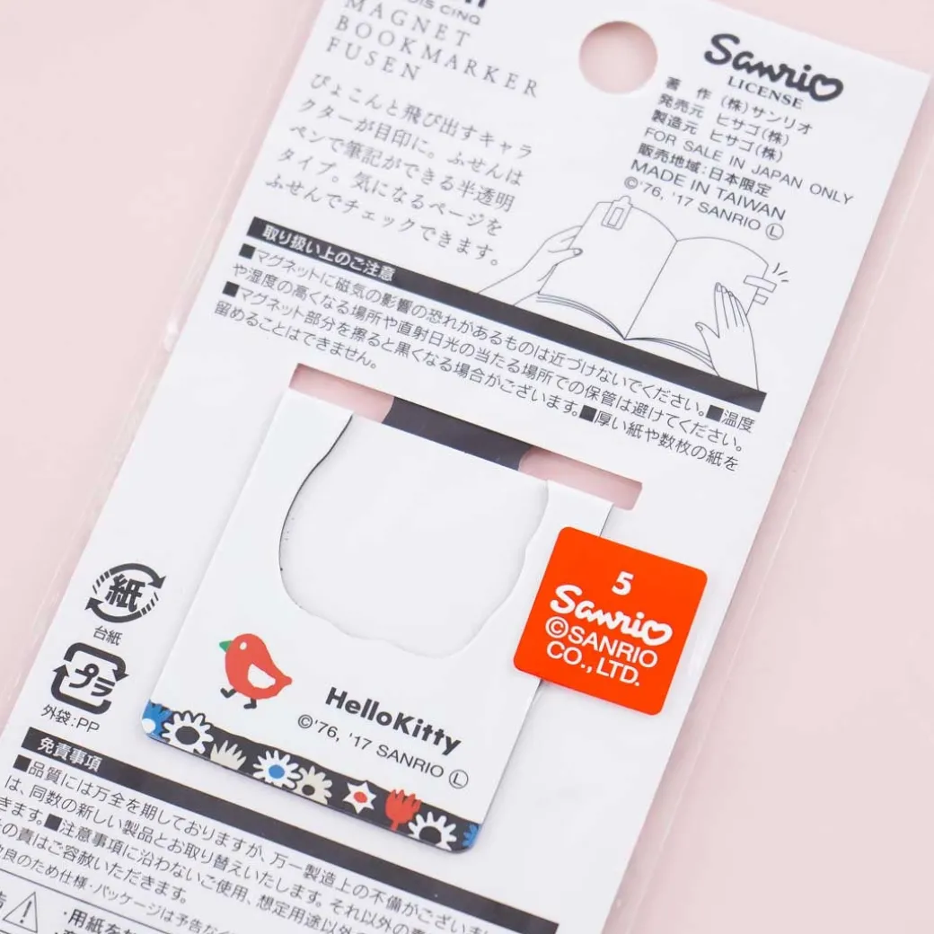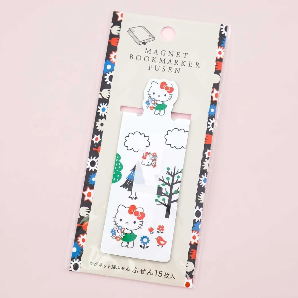 - A kawaii magnet bookmark and sticky tabs set featuring Hello Kitty collecting flowers in the forest