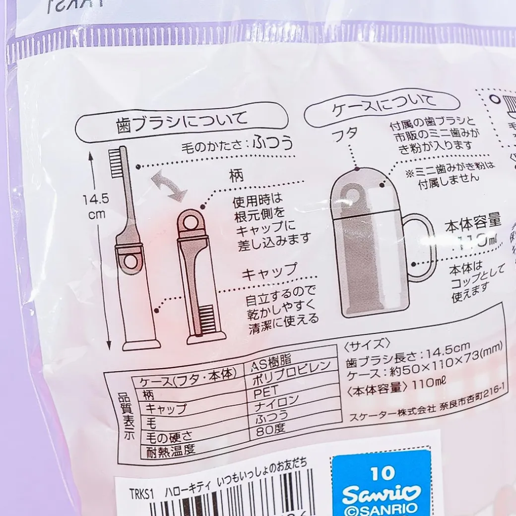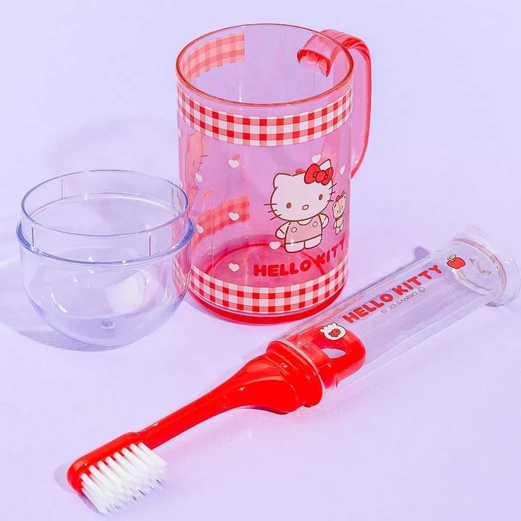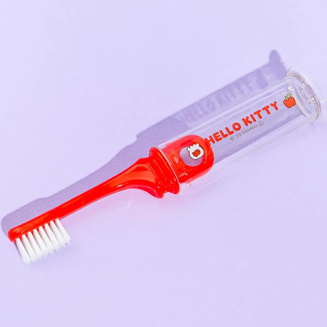 This super kawaii toothbrush set features prints of Hello Kitty hanging out with her friend, Tiny Chum. Bring it along while traveling! It includes a covered cup and a joint toothbrush with a case that you can use as an extension. You can also use the case to store mini toothpaste!