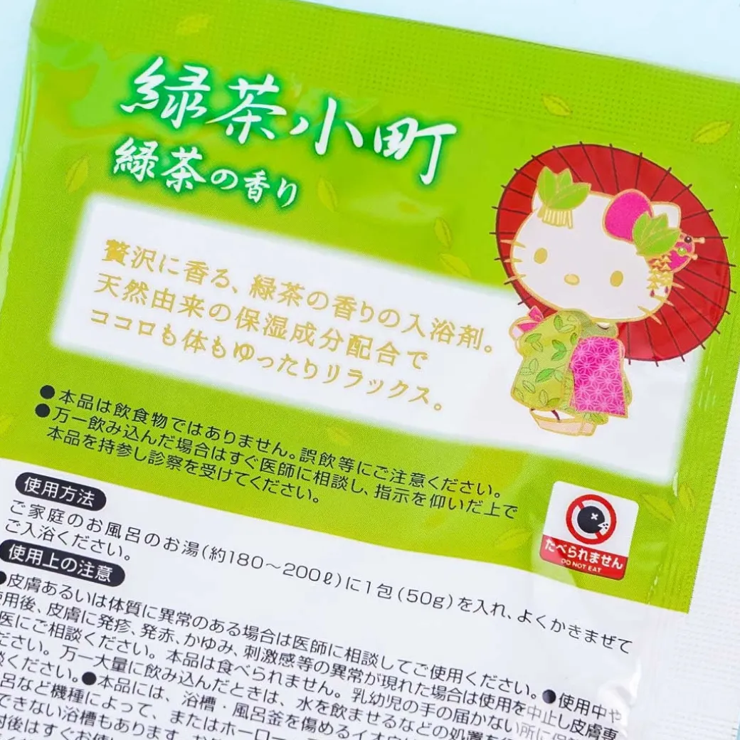 - A pack of bath salt featuring a print of Hello Kitty in a kimono