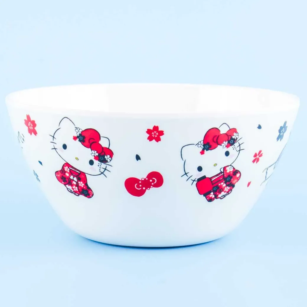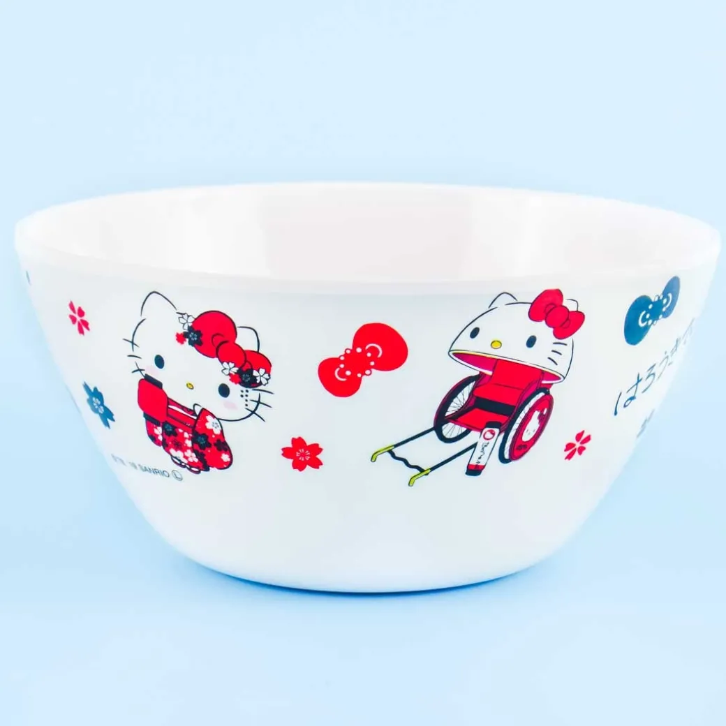 - A kawaii bowl with illustrations of Hello Kitty and sakura blossoms