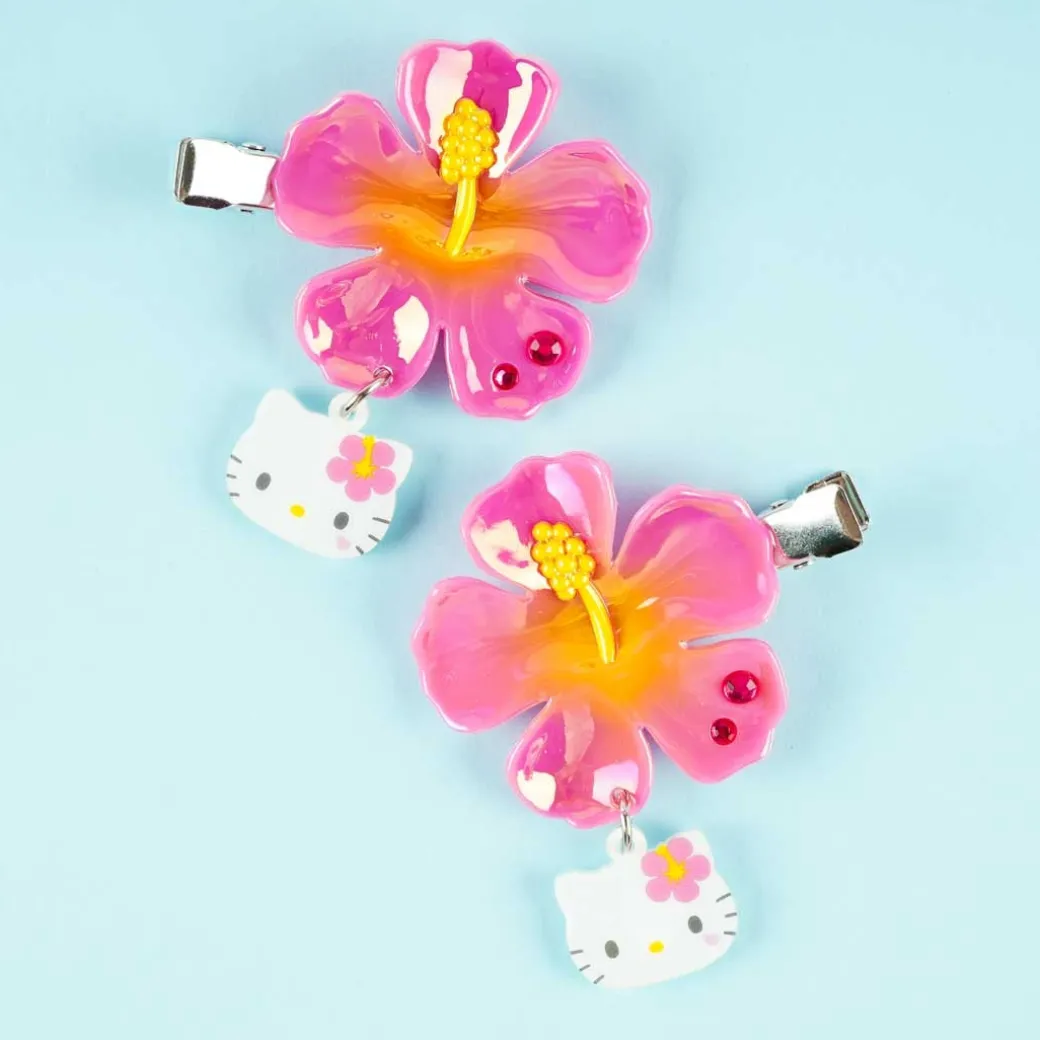 - A kawaii set of hair clips with Hello Kitty and hibiscus decors that fit in with gyaru fashion