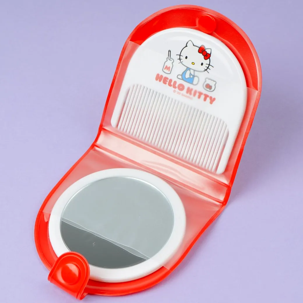 This kawaii comb and mirror set is just what you need for a quick hair fix! It comes with a snap-on vinyl case in a compact size that you can easily bring. The design features cute illustrations of Hello Kitty chilling at home.
