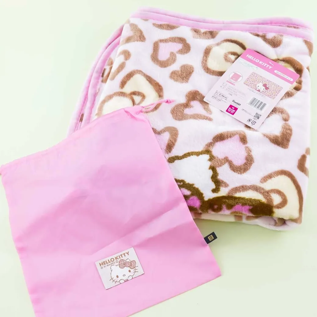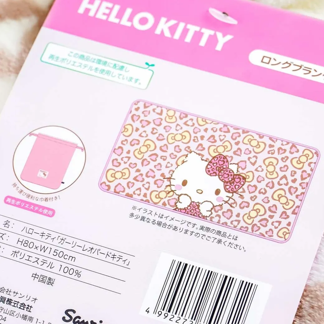 - A cute long blanket illustrated with Hello Kitty in a heart leopard-print dress
