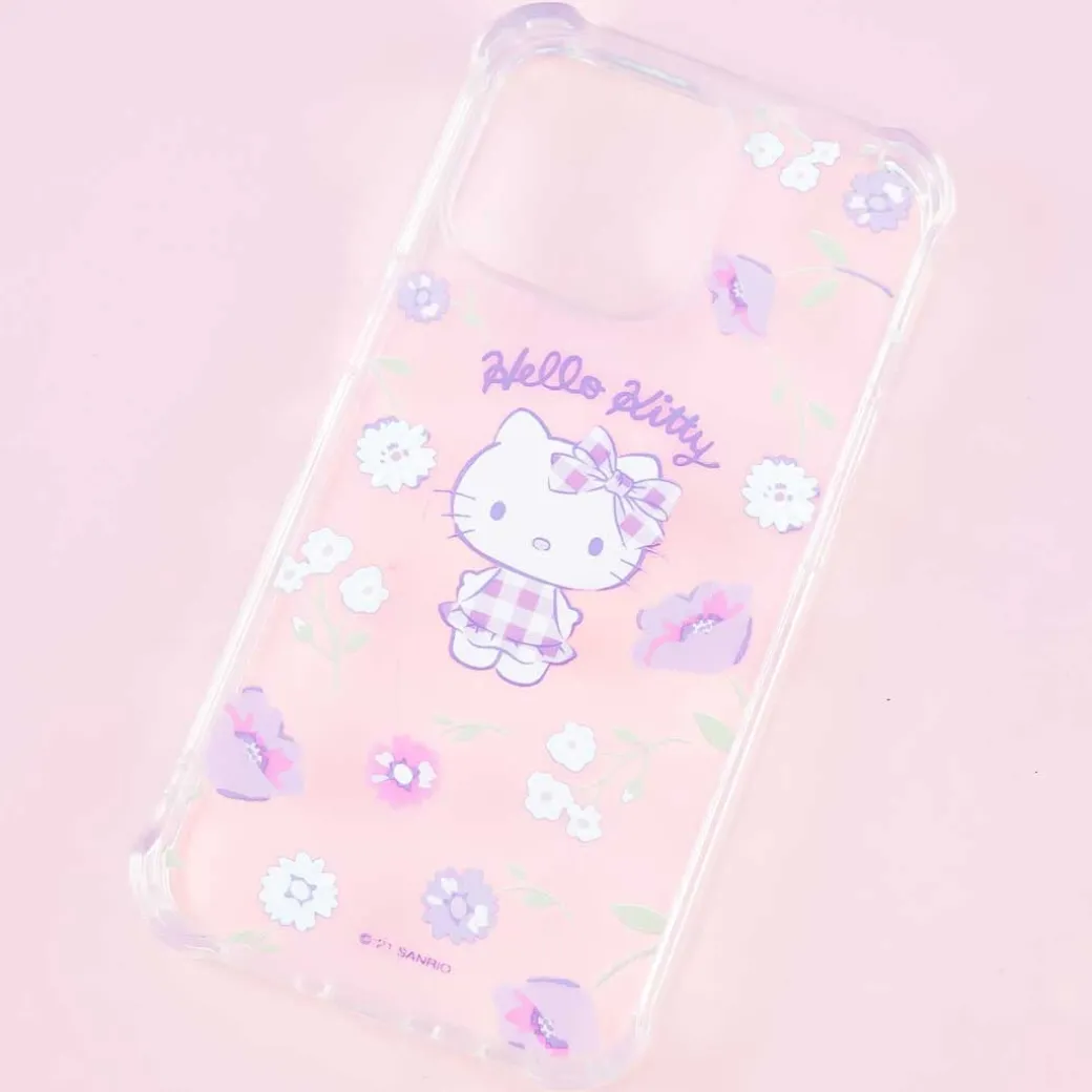 - A kawaii phone case featuring lilac prints of Hello Kitty and flowers